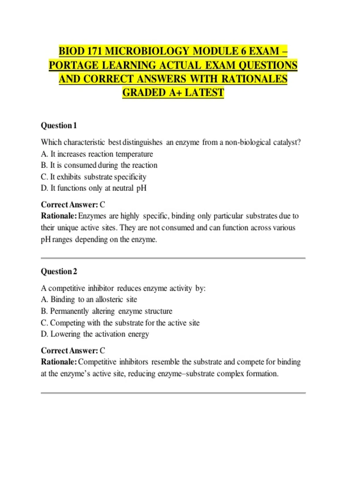 BIOD 171 MICROBIOLOGY MODULE 6 EXAM PORTAGE LEARNING ACTUAL EXAM QUESTIONS AND CORRECT ANSWERS WITH RATIONALES GRADED A+ LATEST BIOD 171 Microbiology – Module 6 Comprehensive Exam (Portage Learning Style) This comprehensive Module 6 examination is designed to closely mirror the rigor, structure, and cognitive demands of the official Portage Learning BIOD 171 Microbiology assessment. The exam evaluates student mastery of microbial metabolism, enzymatic function, bioenergetics, and microbial growth dynamics. Questions across aerobic and anaerobic pathways, enzyme kinetics and inhibition, metabolic integration, environmental effects on microbial physiology, and bacterial growth phases. With clear rationales supporting the correct answers to reinforce learning and exam readiness.