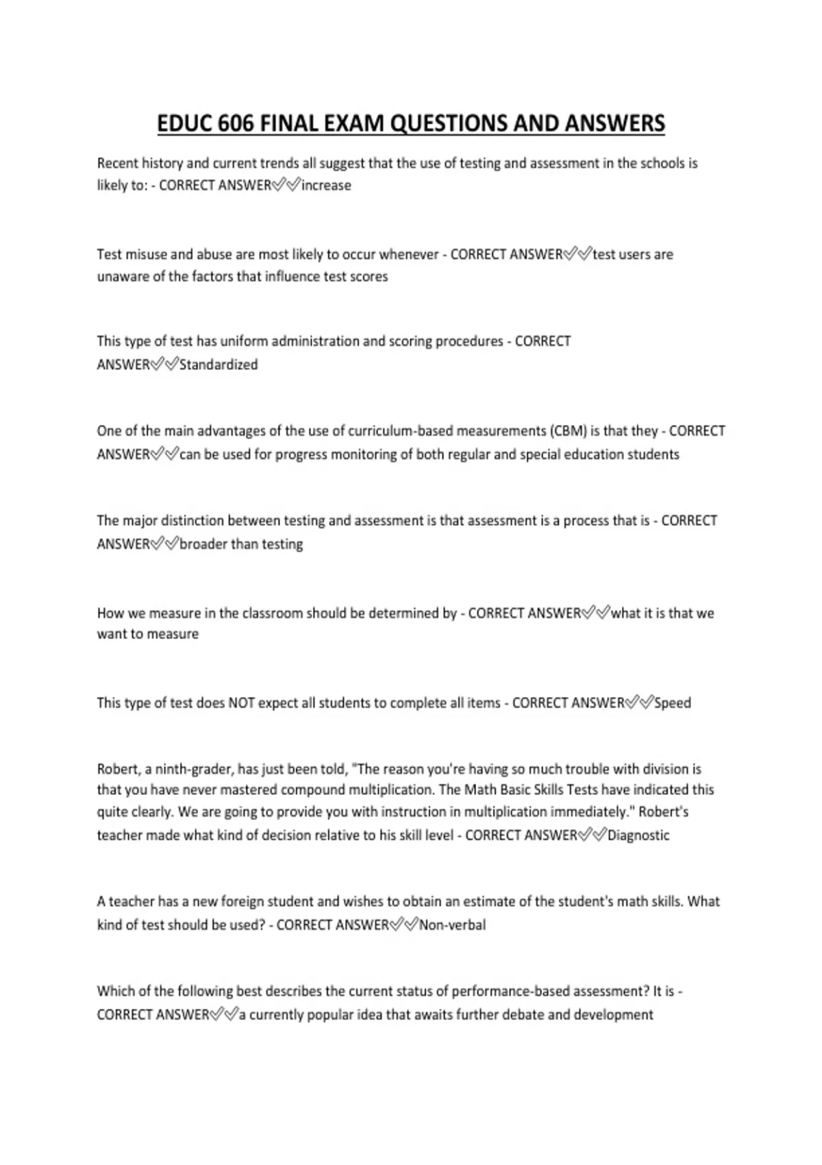 EDUC 606 FINAL EXAM QUESTIONS AND ANSWERS Recent history and current trends all suggest that the use of testing and assessment in the schools is likely to: - CORRECT ANSWERincrease