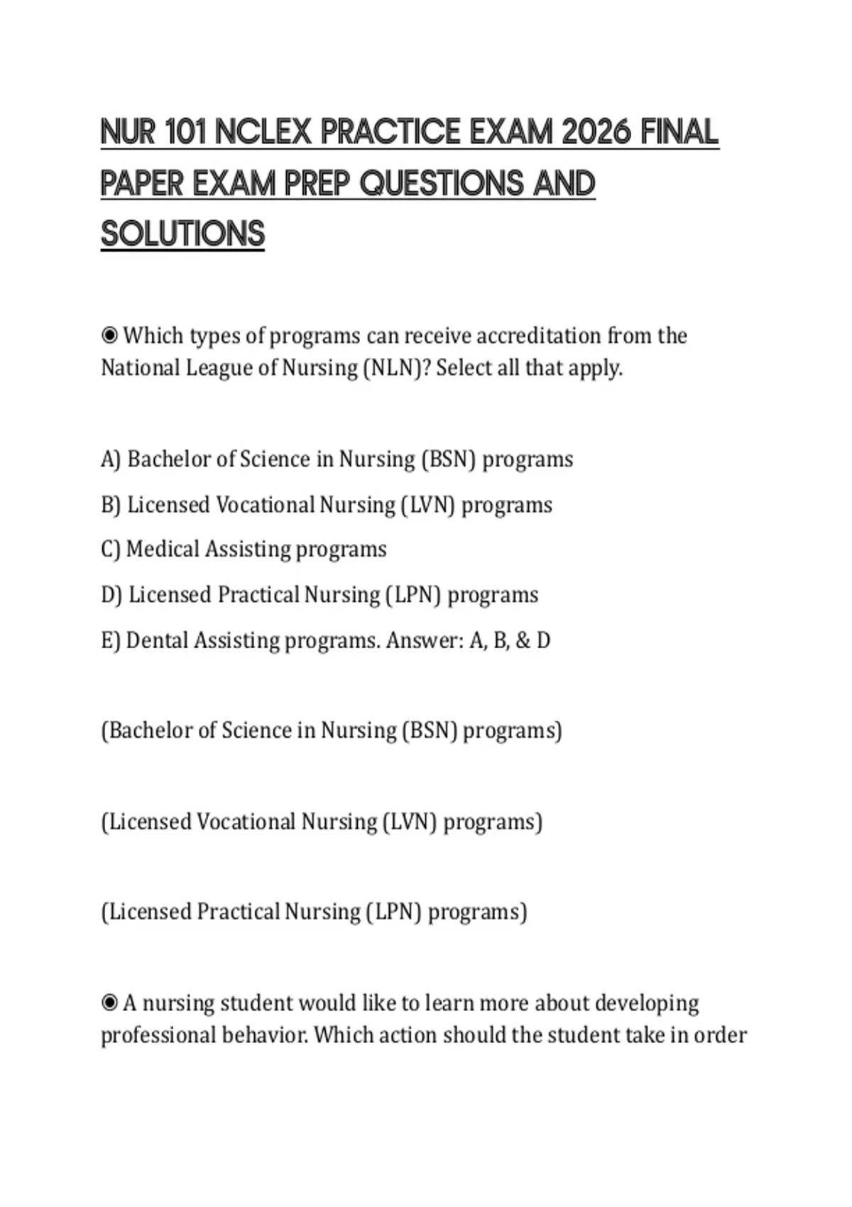 NUR 101 NCLEX PRACTICE EXAM 2026 FINAL