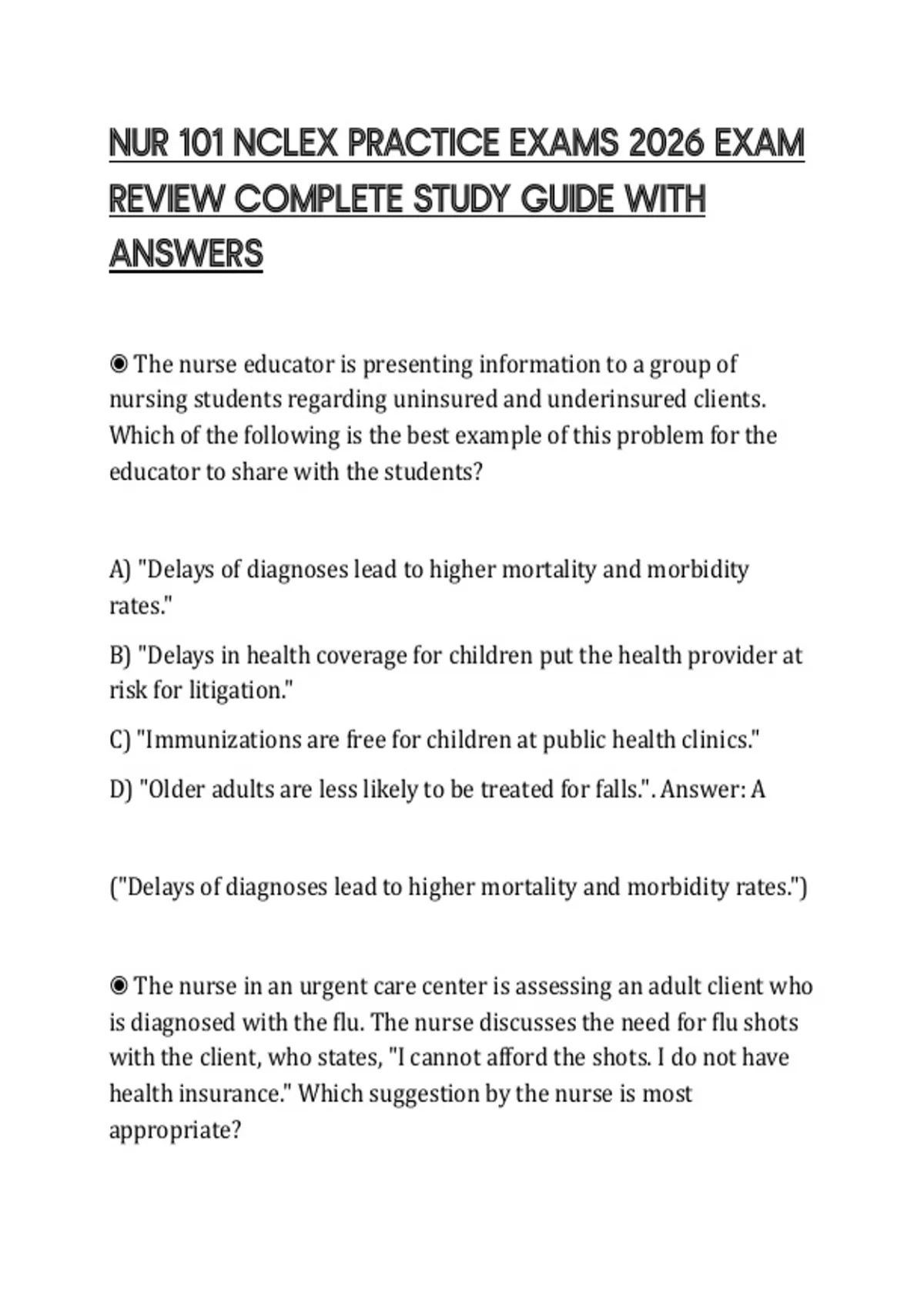 NUR 101 NCLEX PRACTICE EXAMS 2026 EXAM REVIEW COMPLETE STUDY GUIDE WITH ANSWERS