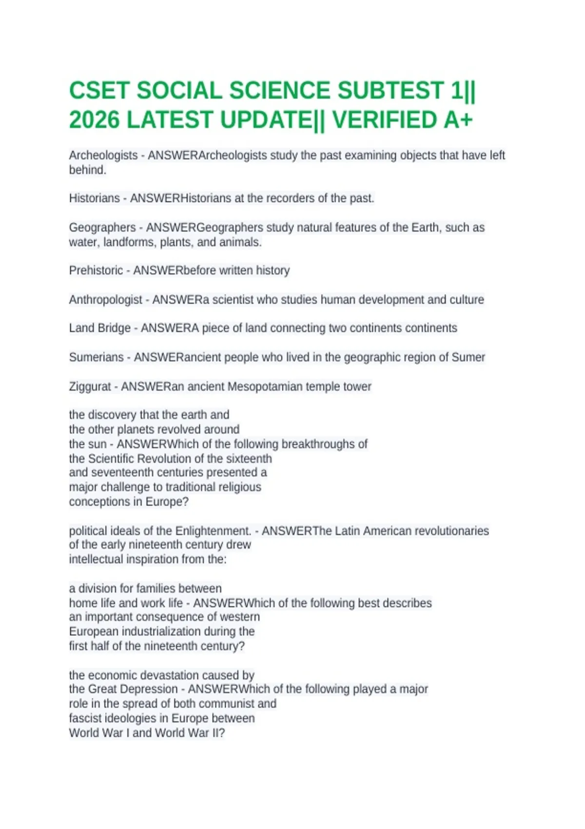 CSET SOCIAL SCIENCE SUBTEST 1|| 2026 LATEST UPDATE|| VERIFIED A+