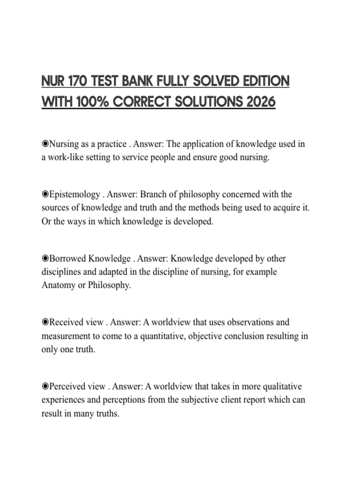 NUR 170 TEST BANK FULLY SOLVED EDITION WITH 100% CORRECT SOLUTIONS 2026