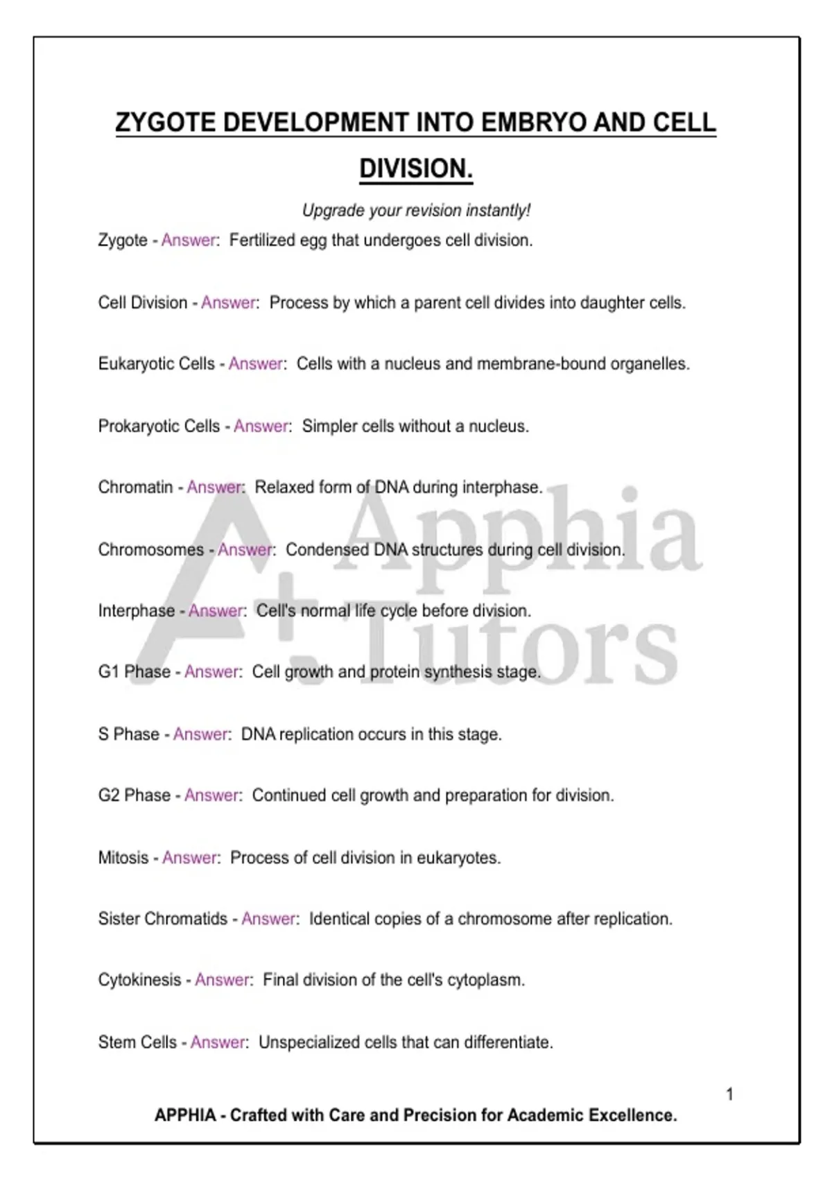 ZYGOTE DEVELOPMENT INTO EMBRYO AND CELL DIVISION. Upgrade your revision instantly!