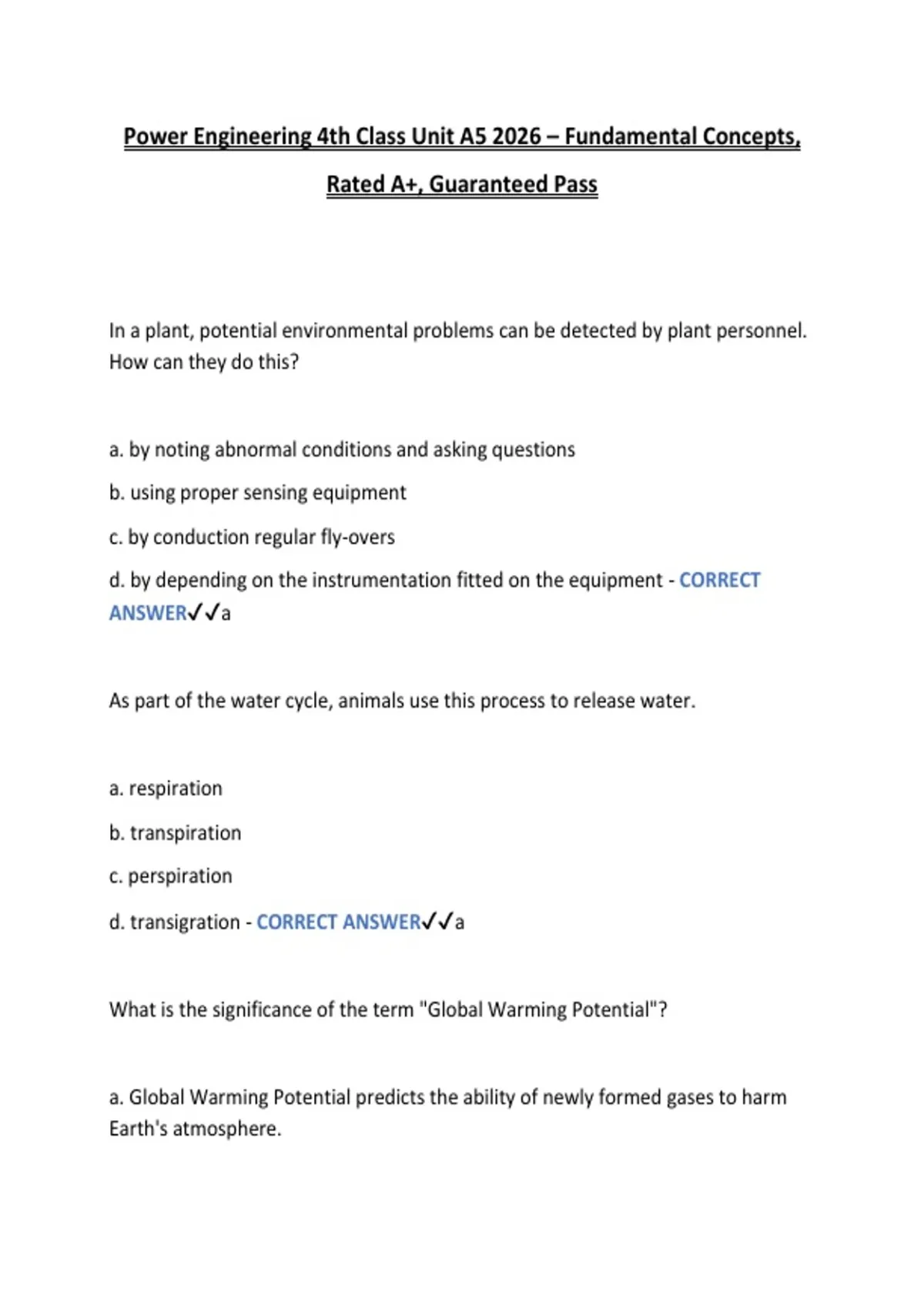 Power Engineering 4th Class Unit A5 2026 – Fundamental Concepts Test Bank, Rated A+, Guaranteed Pass