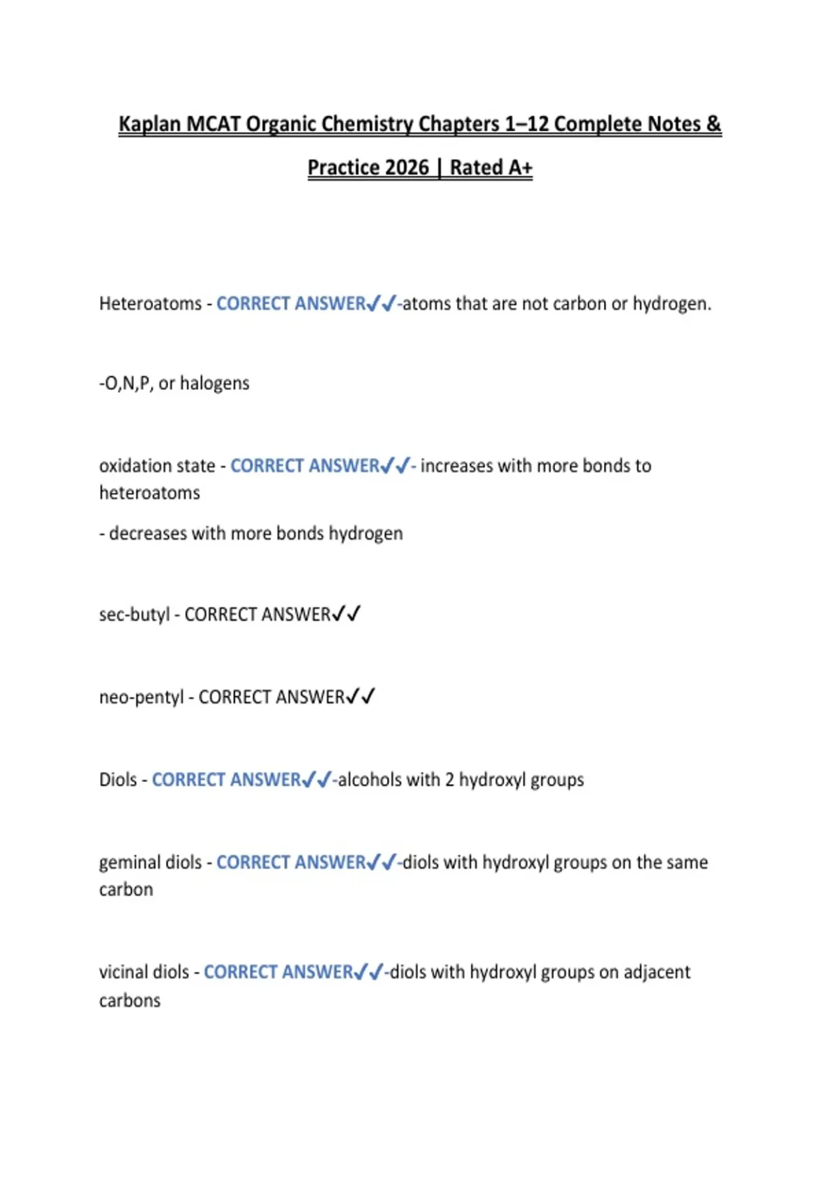 Kaplan MCAT Organic Chemistry Chapters 1–12 Complete Notes & Practice 2026 – Rated A+, Guaranteed PassThis complete study resource for Kaplan MCAT Organic Chemistry Chapters 1–12 is an essential tool for pre-medical students preparing for the MCAT 2026 exam. It includes detailed chapter notes, high-yield summaries, and multiple-choice practice questions with verified answers, covering all foundational topics in organic chemistry such as structure and bonding, functional groups, stereochemistry, reaction mechanisms, spectroscopy, and biomolecules. Rated A+ and aligned with MCAT exam specifications, these notes help students reinforce conceptual understanding, improve problem-solving skills, and develop exam strategies. Ideal for self-assessment, timed practice, and group study, this resource supports mastery of organic chemistry concepts and prepares students for success on the MCAT and in pre-med coursework.
