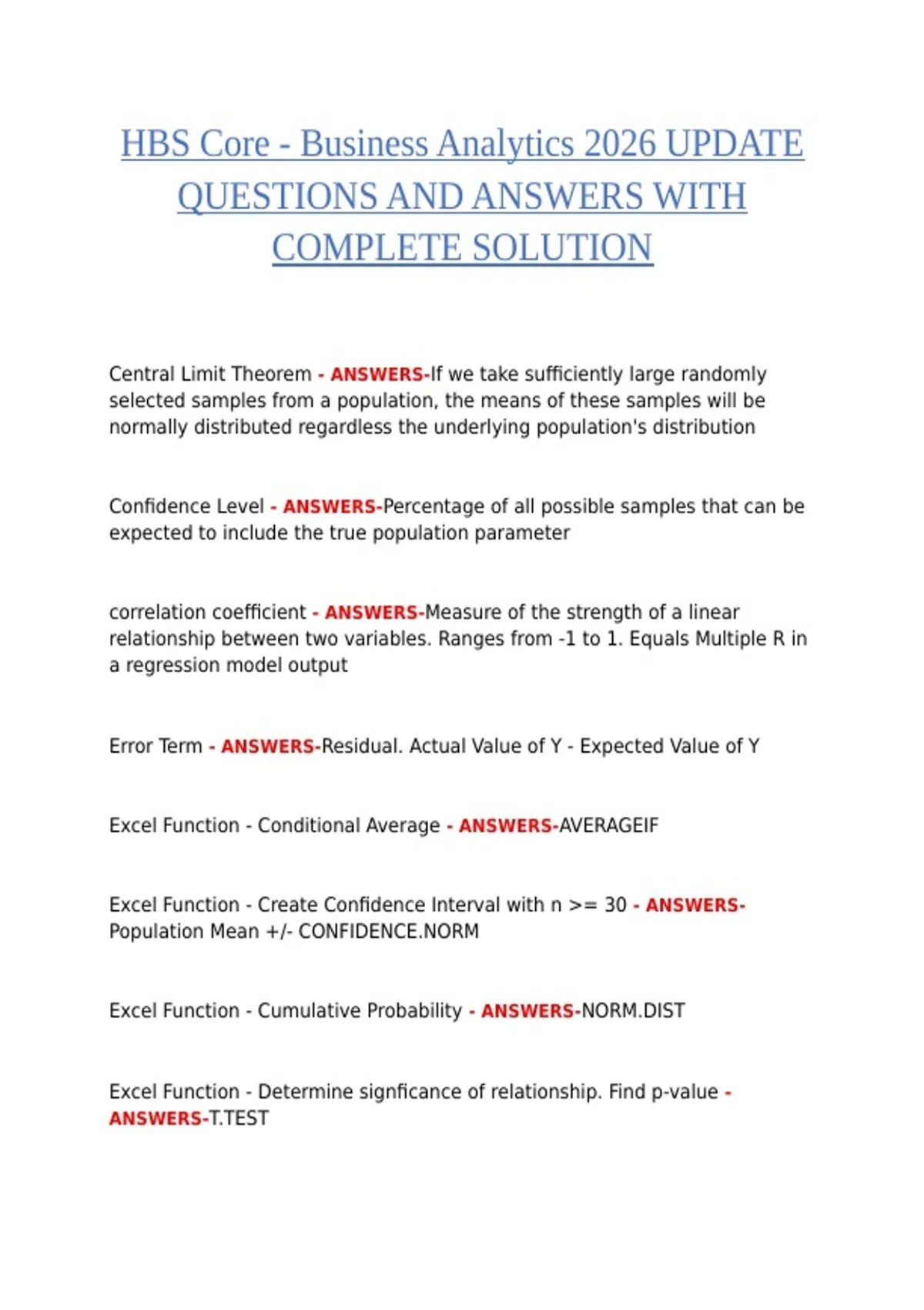 This document is a comprehensive study resource for students preparing for the HBS Core – Business Analytics course in 2026. It contains exam-style questions with verified answers and complete solutions, providing a reliable guide for review, practice, and course mastery. The content covers key business analytics concepts, including data analysis, statistical methods, predictive modeling, decision-making techniques, data visualization, and business problem-solving strategies. Each question includes step-by-step solutions, helping learners strengthen analytical thinking, interpret data accurately, and apply business analytics principles effectively.