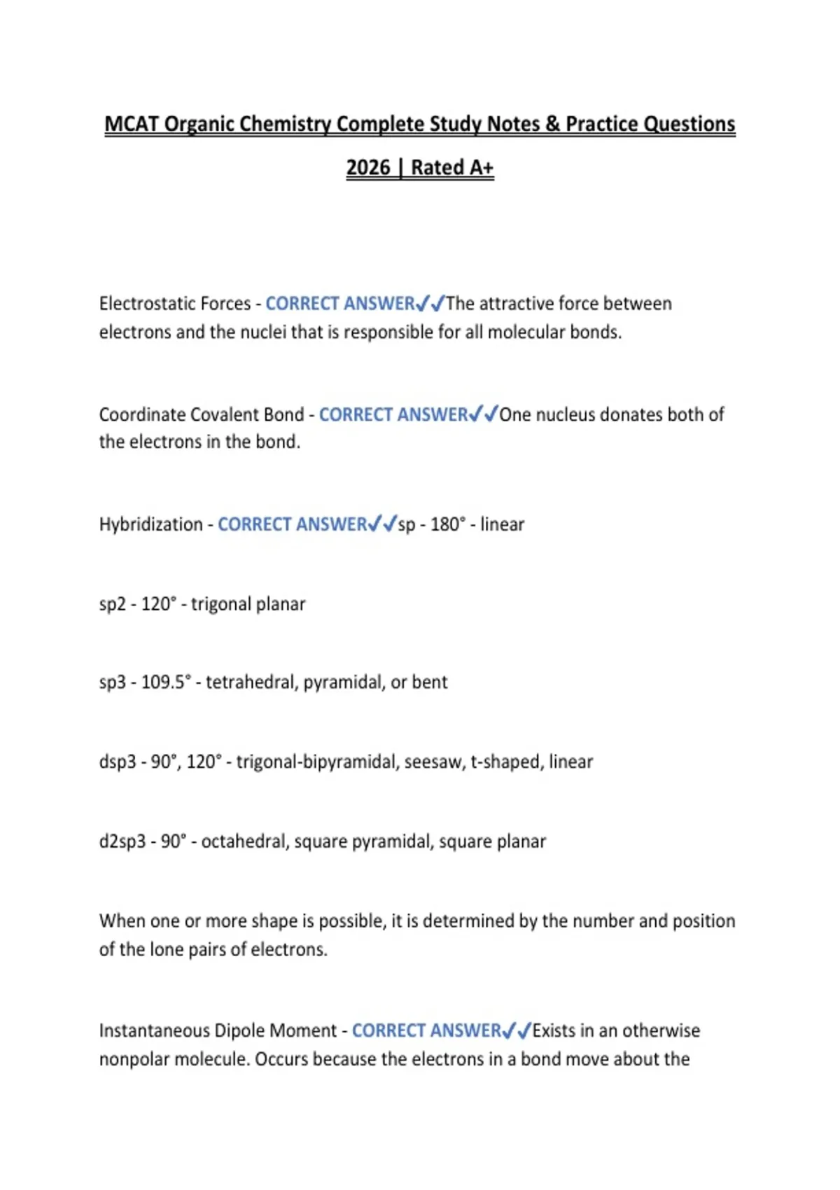 This comprehensive study resource for MCAT Organic Chemistry is designed for pre-medical students preparing for the MCAT 2026 exam. It includes complete chapter notes, high-yield summaries, and practice questions with verified answers covering all key organic chemistry topics such as structure and bonding, functional groups, stereochemistry, reaction mechanisms, spectroscopy, and biomolecules. Rated A+, this resource helps students reinforce conceptual understanding, improve problem-solving skills, and develop exam strategies critical for high MCAT performance. Ideal for self-assessment, timed practice, and group study, it supports mastery of organic chemistry principles and ensures thorough preparation for MCAT exams and pre-med coursework. A must-have for students aiming to excel in both theoretical and applied organic chemistry.MCAT Organic Chemistry Complete Study Notes & Practice Questions 2026 Rated A+