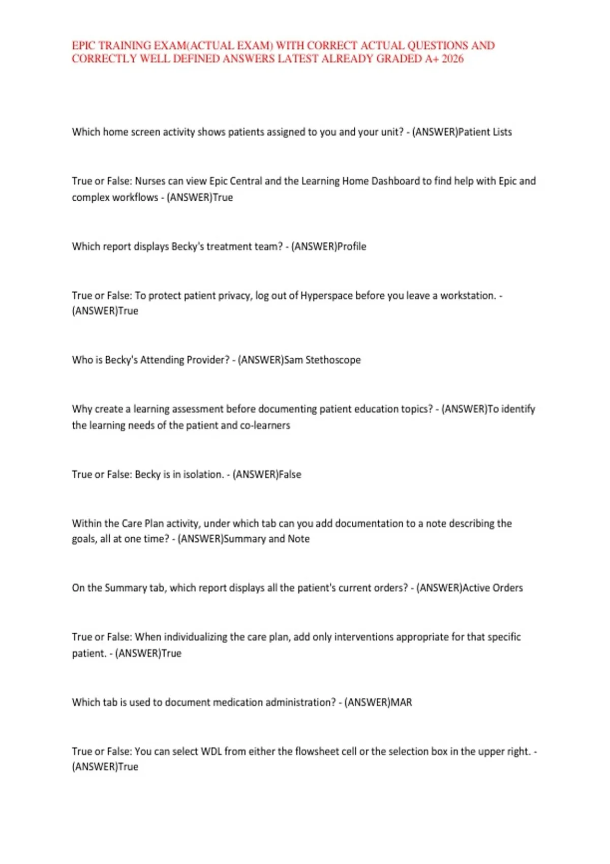 EPIC TRAINING EXAM(ACTUAL EXAM) WITH CORRECT ACTUAL QUESTIONS AND