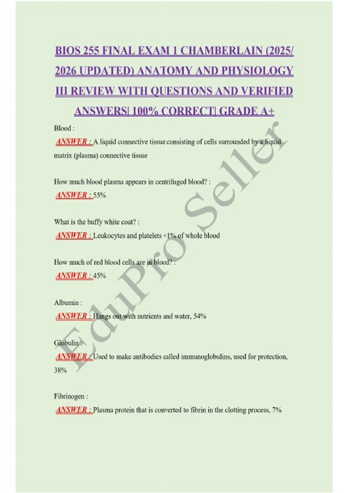 BIOS 255 FINAL EXAM 1 CHAMBERLAIN (2025/ 2026 UPDATED) ANATOMY AND PHYSIOLOGY III REVIEW WITH QUESTIONS AND VERIFIED ANSWERS| 100% CORRECT| GRADE A+