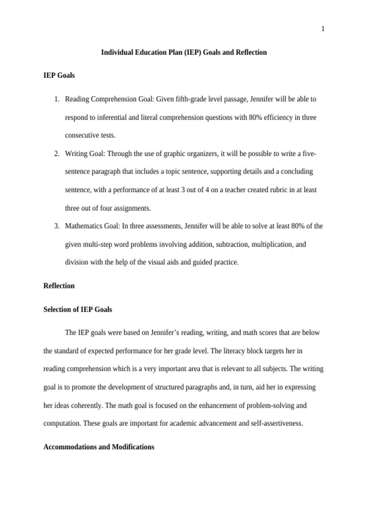 IEP Goals and reflection essay