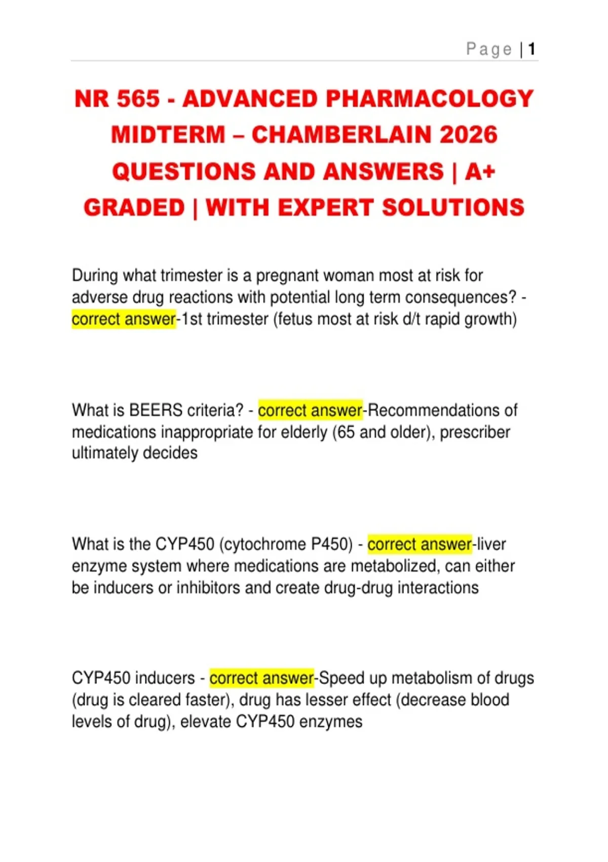 This document contains a comprehensive NR 565 Advanced Pharmacology midterm exam study resource with detailed questions and correct answers, aligned with Chamberlain University coursework. It covers high-yield pharmacology concepts including pharmacokinetics and pharmacodynamics, CYP450 interactions, pregnancy and pediatric considerations, geriatric pharmacology, opioid prescribing, controlled substances, hypertension management, cardiovascular drugs, pain management, rheumatologic therapies, and exam-relevant clinical decision-making. The material is fully graded and structured for efficient review and midterm exam preparation.