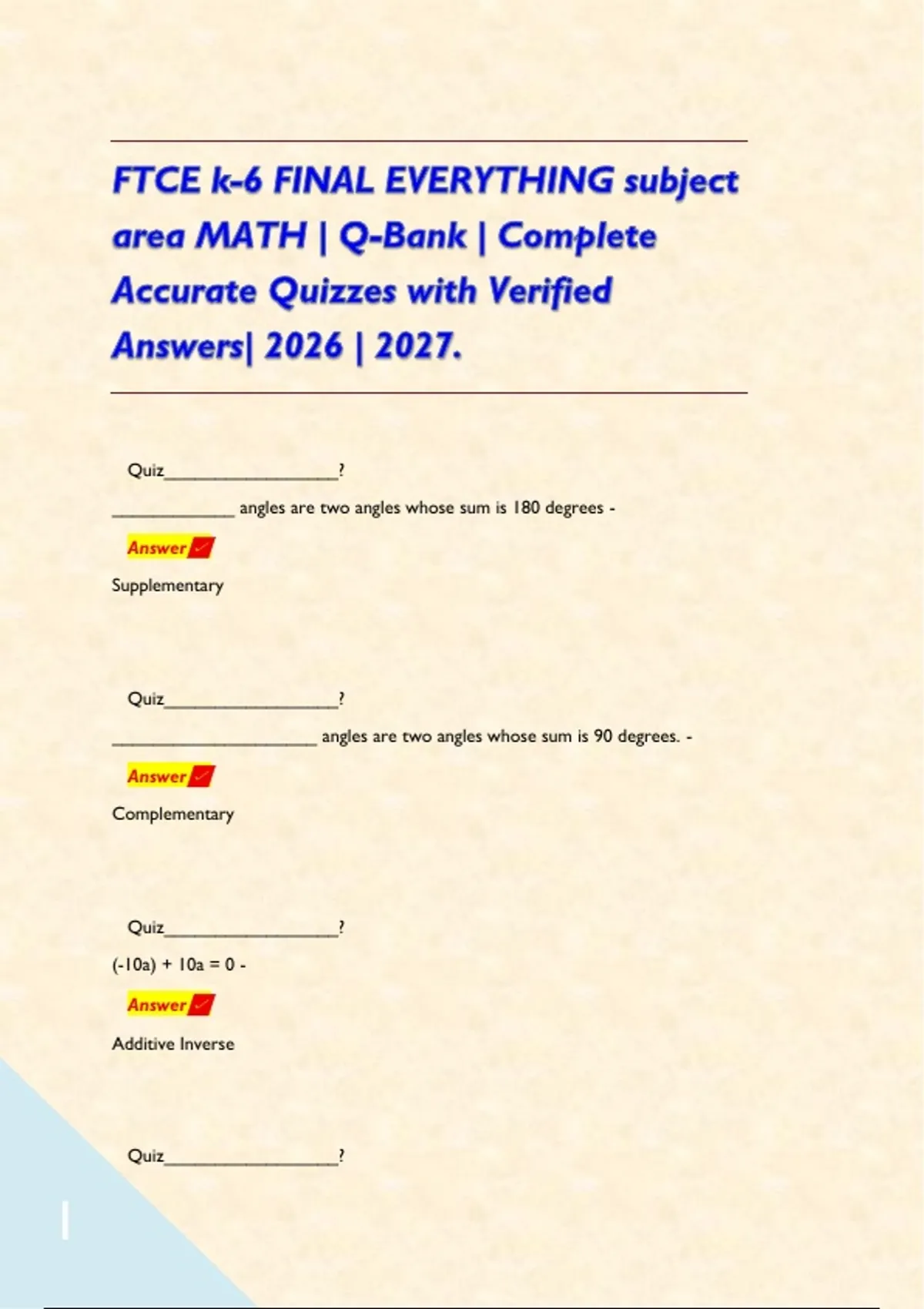 FTCE k-6 FINAL EVERYTHING subject area MATH | Q-Bank | Complete Accurate Quizzes with Verified Answers| 2026 | 2027.