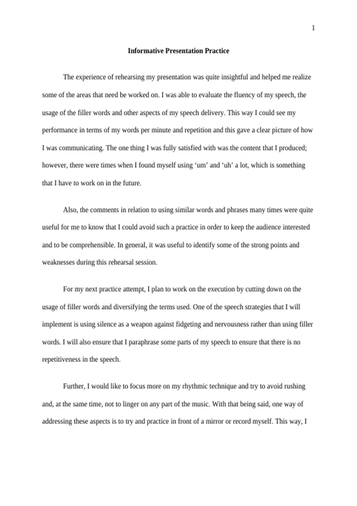 some of the areas that need be worked on. I was able to evaluate the fluency of my speech, the