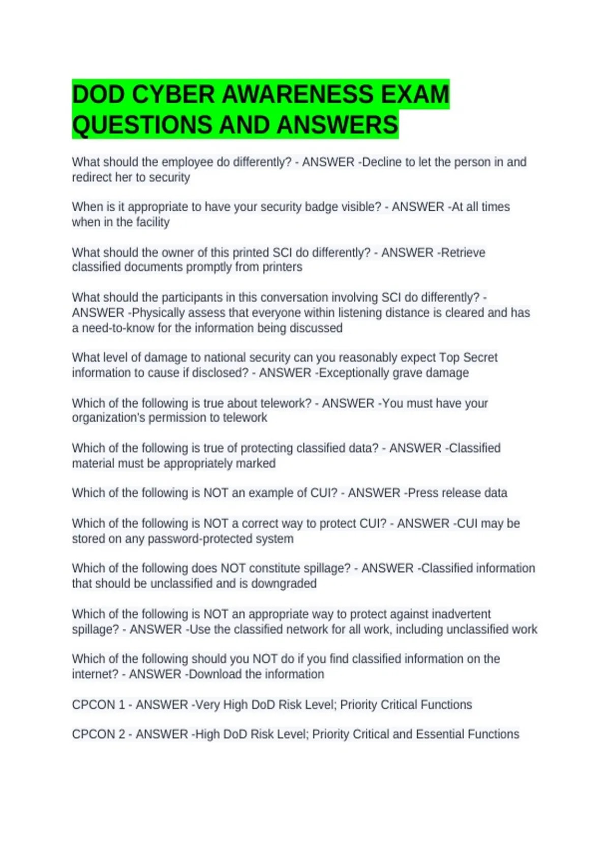 DOD CYBER AWARENESS EXAM QUESTIONS AND ANSWERS