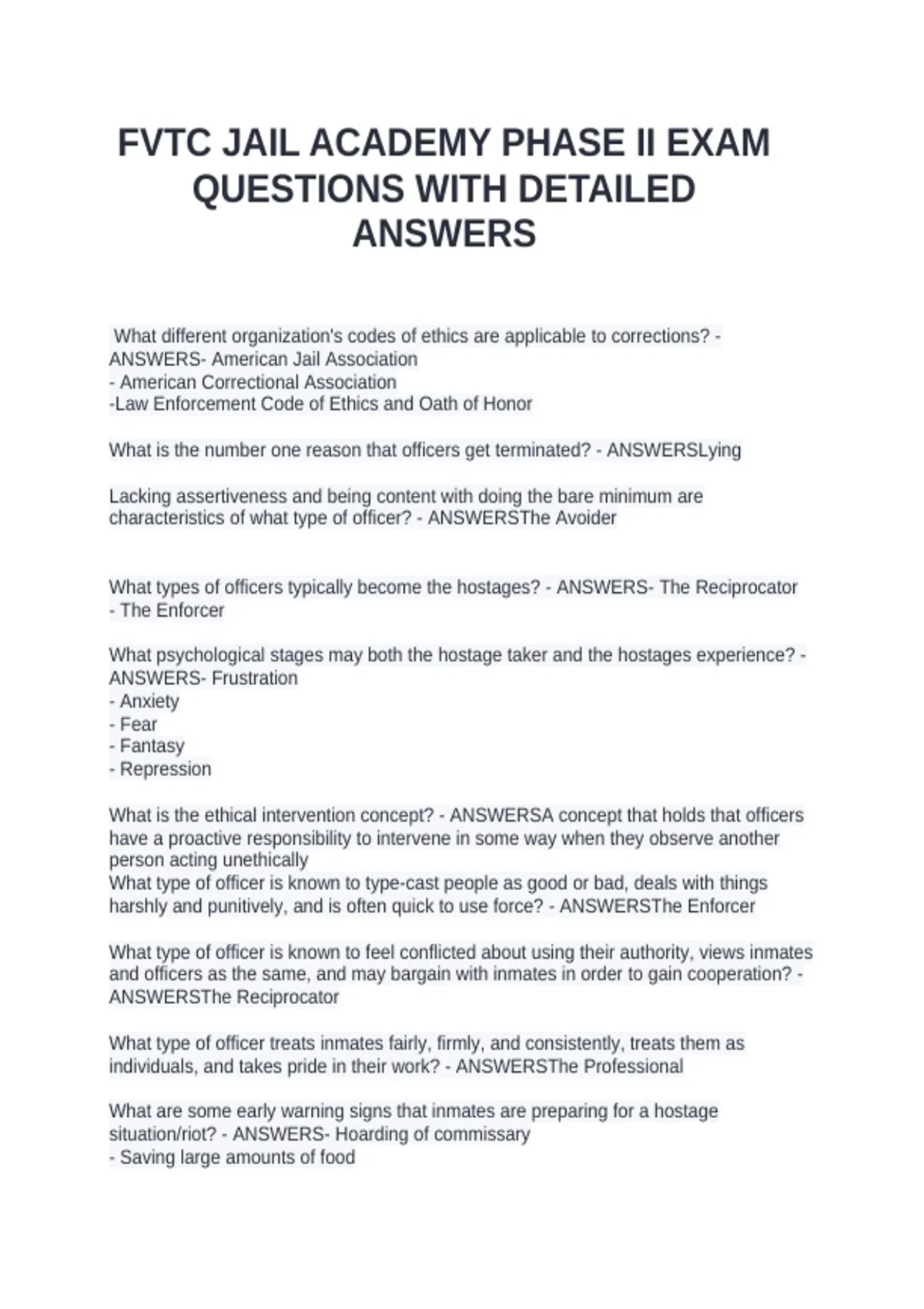 What different organization's codes of ethics are applicable to corrections? - ANSWERS- American Jail Association - American Correctional Association -Law Enforcement Code of Ethics and Oath of Honor What is the number one reason that officers get terminated? - ANSWERSLying Lacking assertiveness and being content with doing the bare minimum are characteristics of what type of officer? - ANSWERSThe Avoider What types of officers typically become the hostages? - ANSWERS- The Reciprocator - The Enforcer What psychological stages may both the hostage taker and the hostages experience? - ANSWERS- Frustration - Anxiety - Fear - Fantasy - Repression What is the ethical intervention concept? - ANSWERSA concept that holds that officers have a proactive responsibility to intervene in some way when they observe another person acting unethically What type of officer is known to type-cast people as good or bad, deals with things harshly and punitively, and is often quick to use force? - ANSWERSThe Enforcer What type of officer is known to feel conflicted about using their authority, views inmates and officers as the same, and may bargain with inmates in order to gain cooperation? - ANSWERSThe Reciprocator