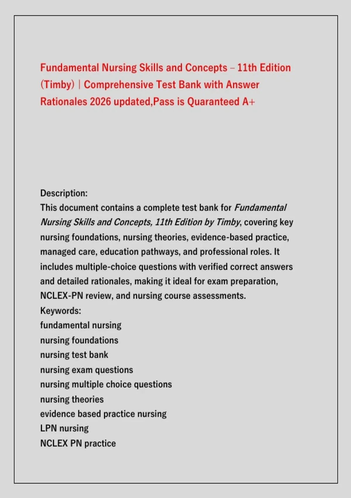 Fundamental Nursing Skills and Concepts – 11th Edition (Timby) | Comprehensive Test Bank with Answer Rationales 2026 updated,Pass is Quaranteed A+