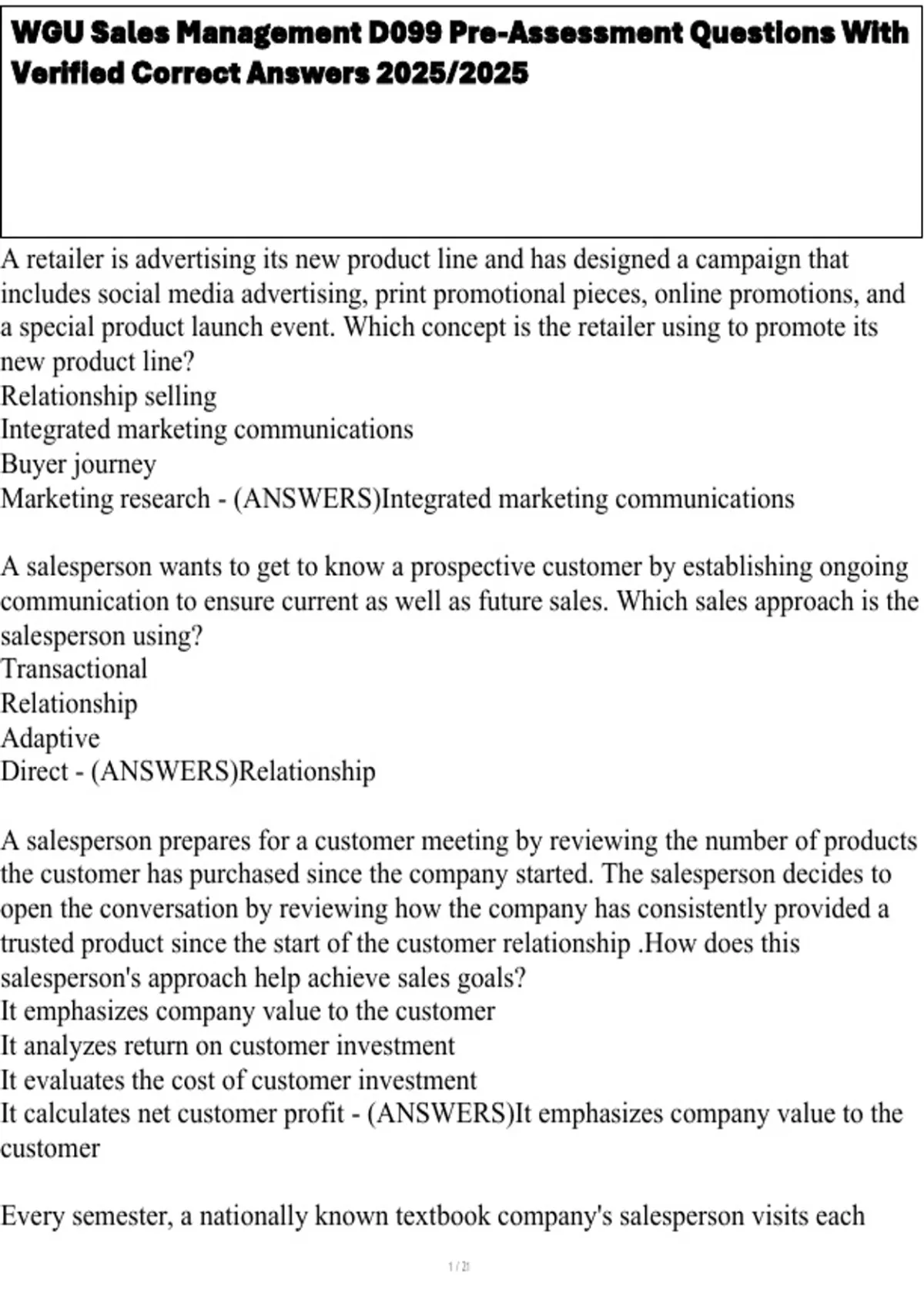 , WGU Sales Management D099 Pre-Assessment Questions With