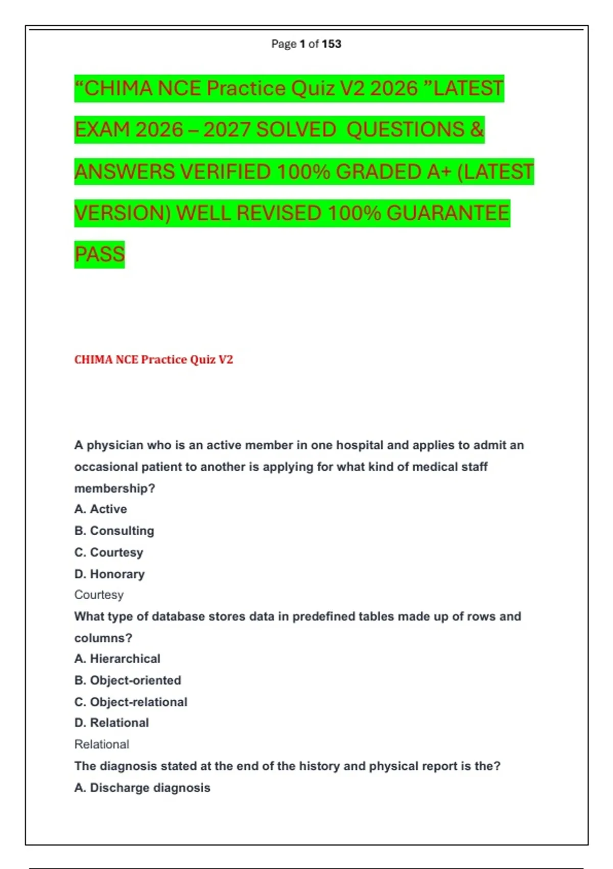 “CHIMA NCE Practice Quiz V2 2026 ”LATEST EXAM 2026 – 2027 SOLVED QUESTIONS & ANSWERS VERIFIED 100% GRADED A+ (LATEST VERSION) WELL REVISED 100% GUARANTEE PASS