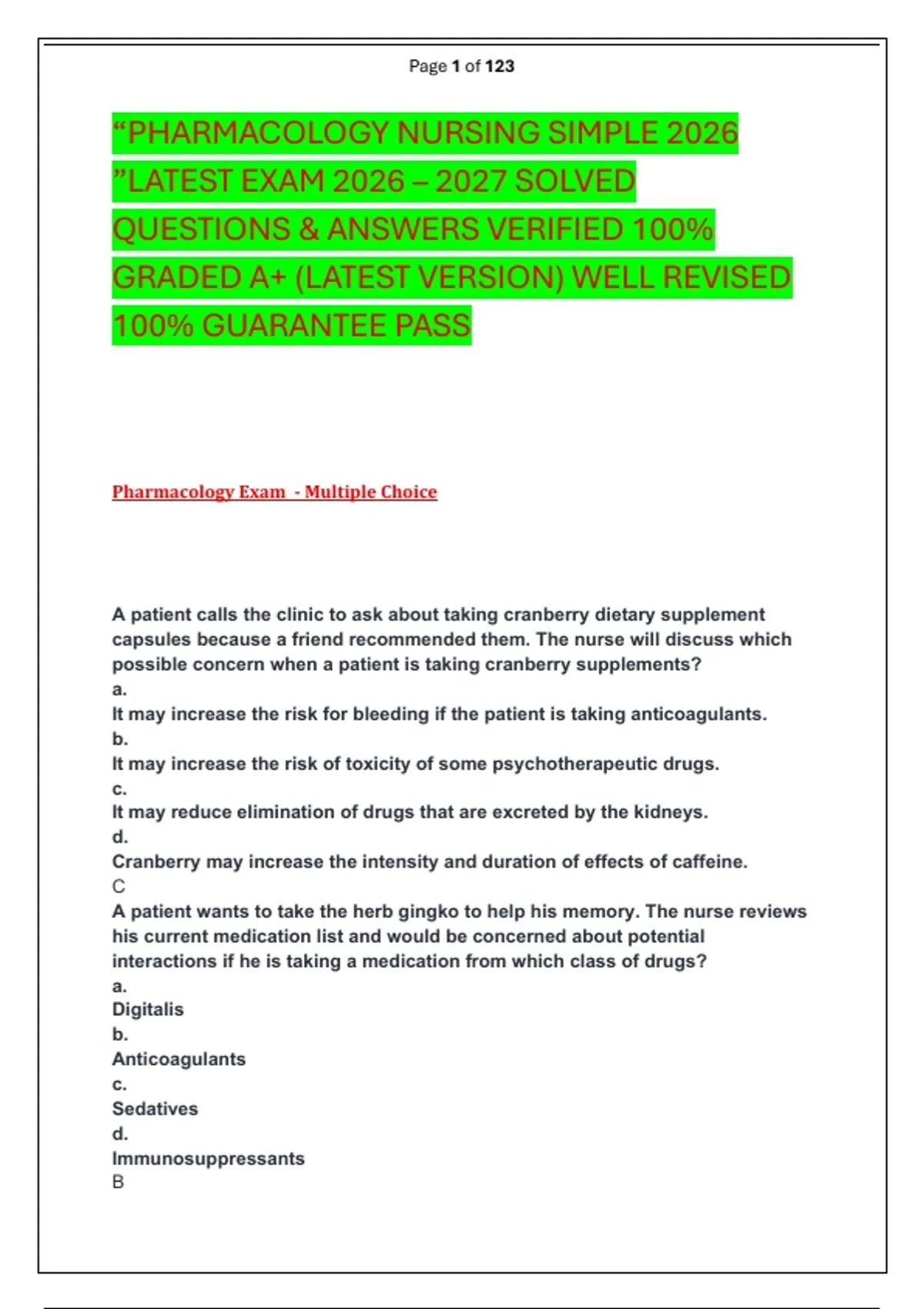 “PHARMACOLOGY NURSING SIMPLE 2026 ”LATEST EXAM 2026 – 2027 SOLVED QUESTIONS & ANSWERS VERIFIED 100% GRADED A+ (LATEST VERSION) WELL REVISED 100% GUARANTEE PASS
