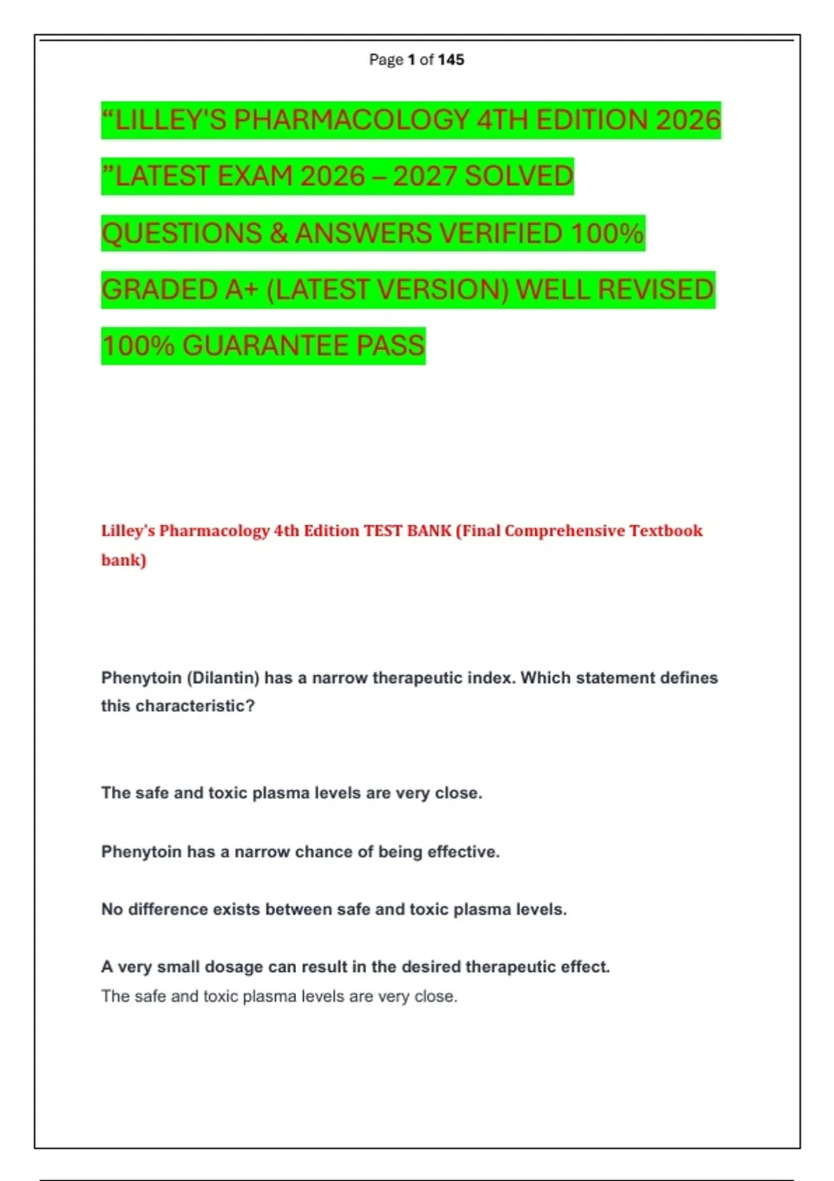 Lilley's Pharmacology 4th Edition TEST BANK (Final Comprehensive Textbook