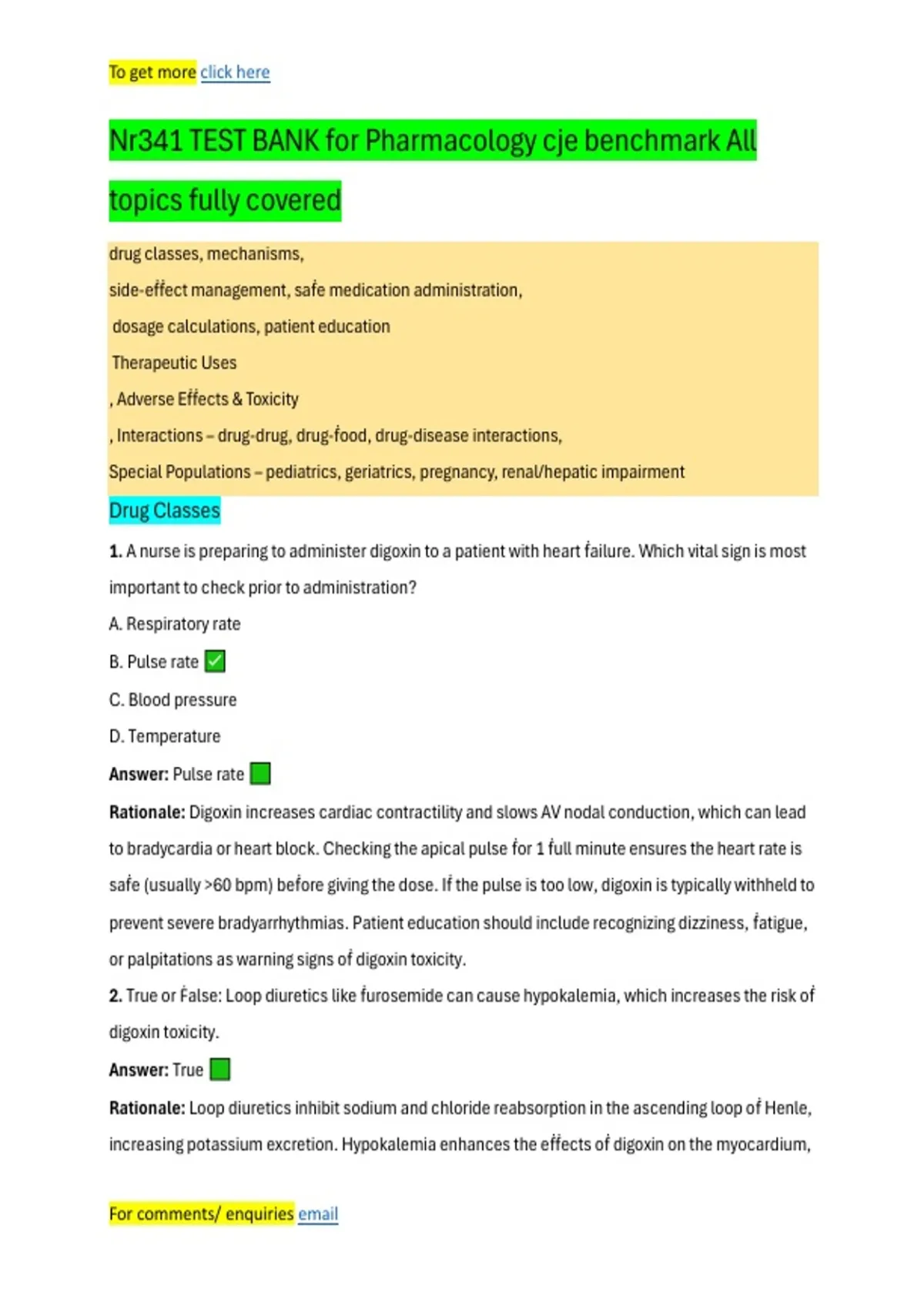 This NR341 Pharmacology CJE Benchmark test bank provides extensive practice questions covering major drug classes, mechanisms of action, side effects, contraindications, and nursing considerations. It is designed to support nursing students preparing for NR341 benchmarks, quizzes, and pharmacology exams through targeted exam-style questions.