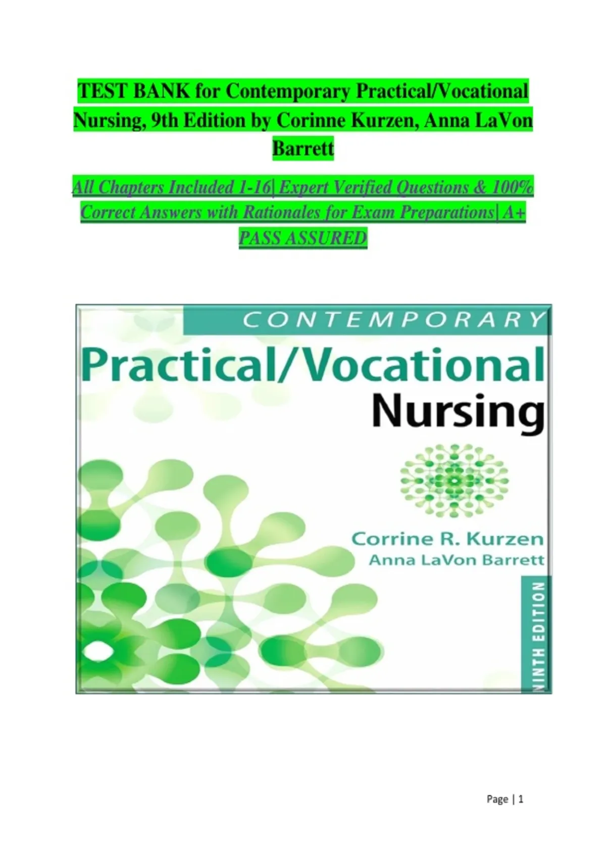 TEST BANK for Contemporary Practical/Vocational Nursing, 9th Edition by Corinne Kurzen, Anna LaVon Barrett All Chapters Included 1-16| Expert Verified Questions & 100% Correct Answers with Rationales for Exam Preparations| A+ PASS ASSURED Chapter 1,