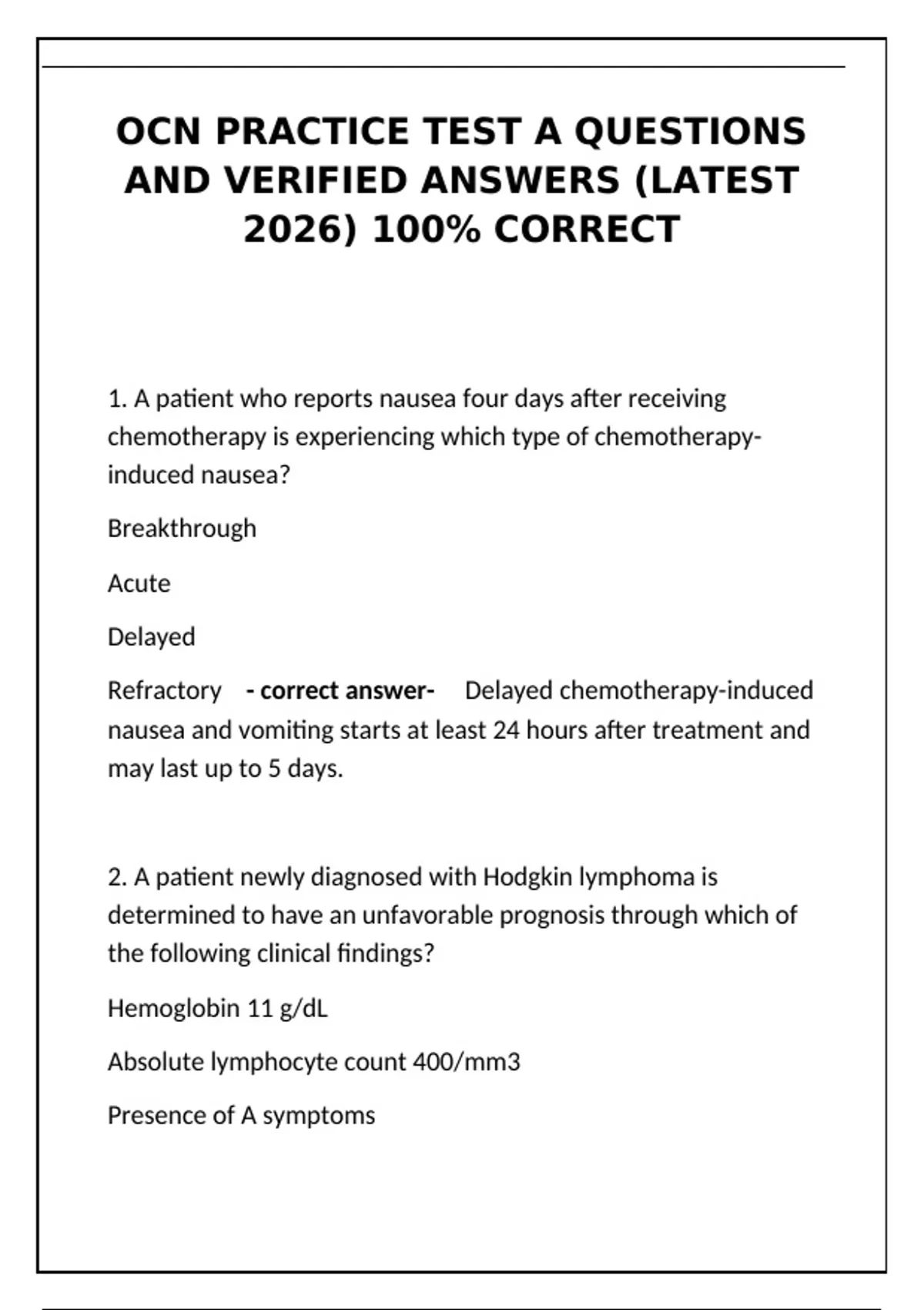 Get ready for the OCN exam with Practice Test A (2026). Features 100% verified questions on chemotherapy, radiation, symptom management, oncologic emergencies, and nursing interventions.