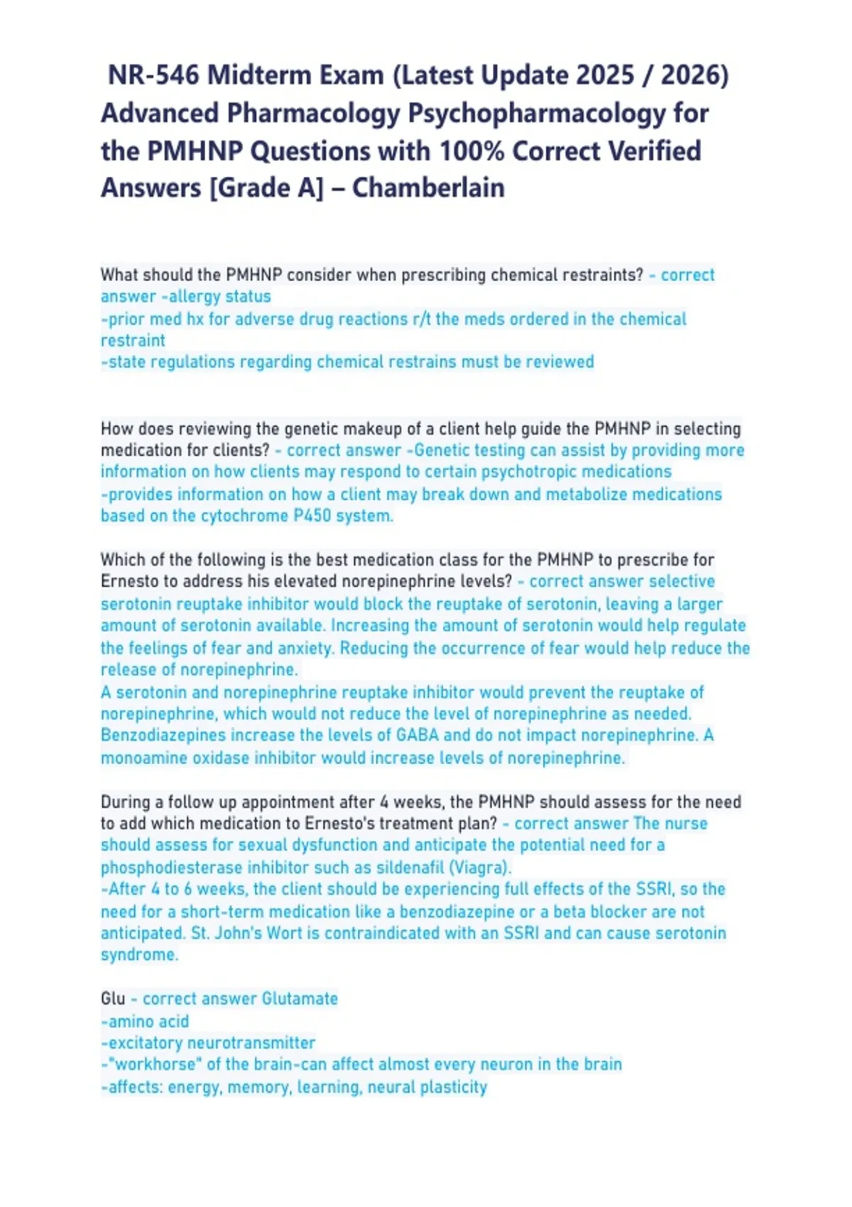 This document contains an advanced psychopharmacology midterm exam for PMHNP students, updated for 2025–2026, with 100% verified correct answers. It covers psychiatric medications, mechanisms of action, therapeutic uses, side effects, contraindications, and clinical decision-making aligned with Chamberlain curriculum standards.