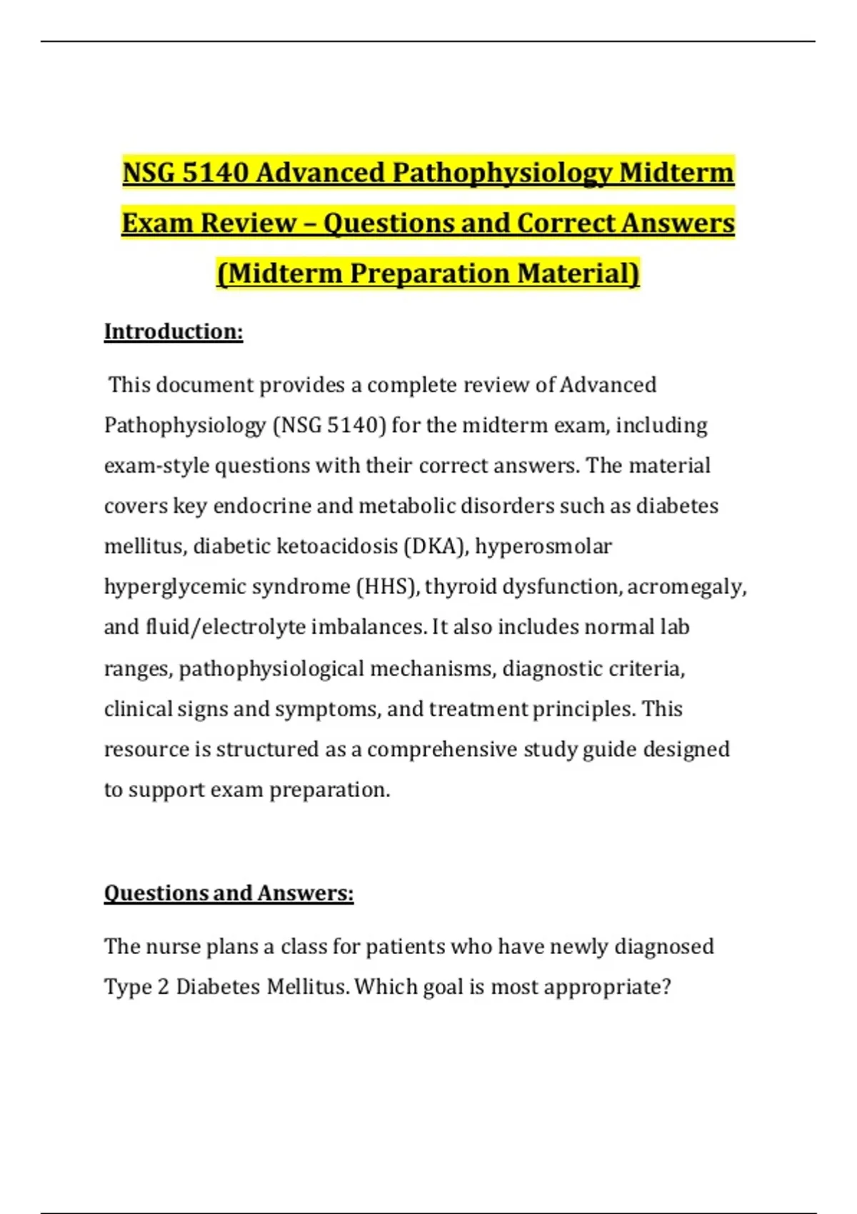 This midterm exam review for NSG 5140 Advanced Pathophysiology includes carefully selected questions with accurate, verified answers to support midterm preparation. The material covers essential pathophysiology topics such as cellular processes, inflammation, metabolic dysfunction, and system-based disease mechanisms. It is designed as focused study material to reinforce key concepts and improve exam performance