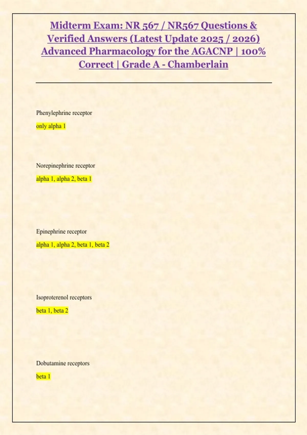This NR 567 Advanced Pharmacology midterm exam resource for AGACNP students includes high-yield questions with verified answers. It covers cardiovascular drugs, critical care pharmacology, endocrine emergencies, and advanced medication management.