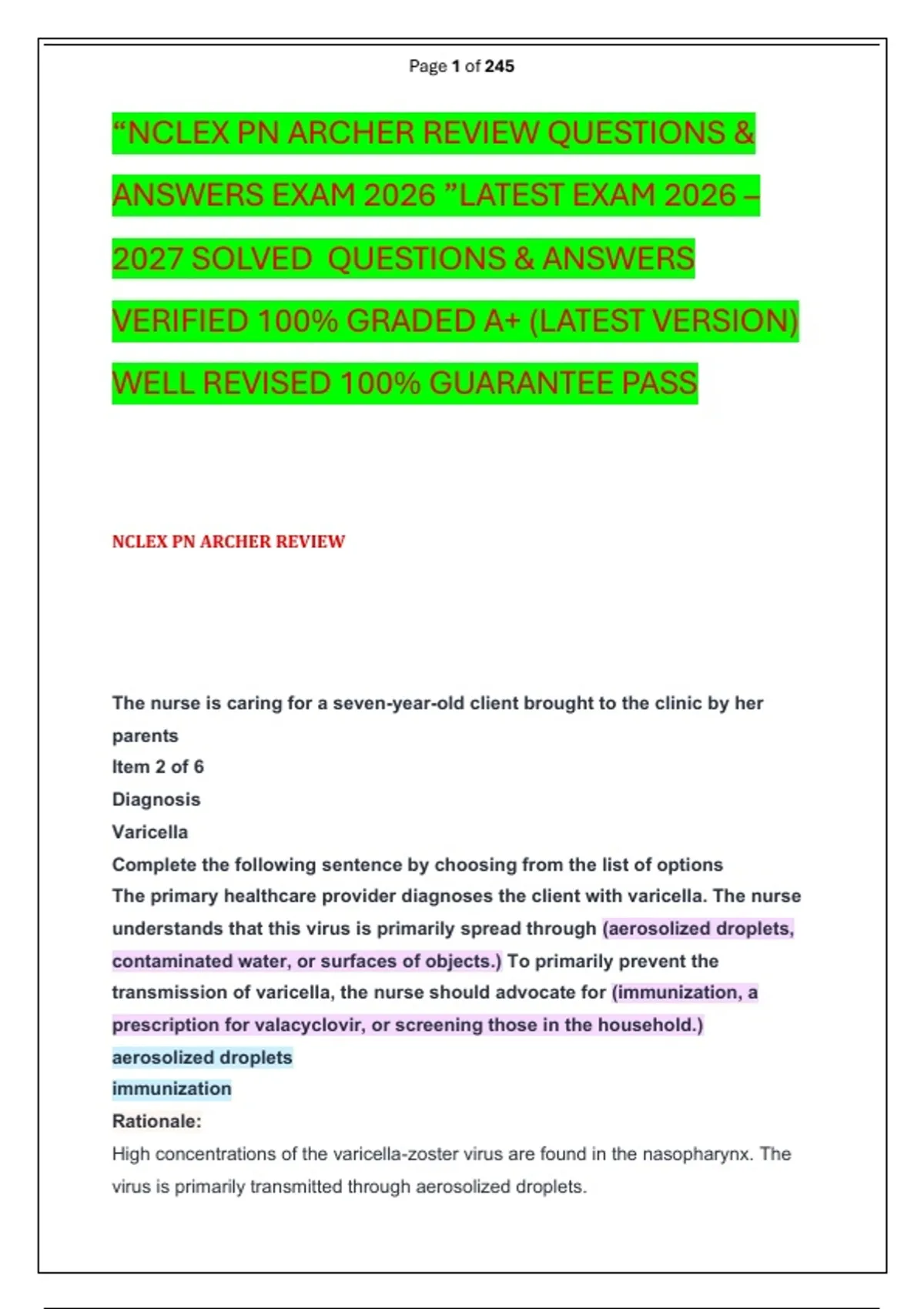 “NCLEX PN ARCHER REVIEW QUESTIONS & ANSWERS EXAM 2026 ”LATEST EXAM 2026 – 2027 SOLVED QUESTIONS & ANSWERS VERIFIED 100% GRADED A+ (LATEST VERSION) WELL REVISED 100% GUARANTEE PASS