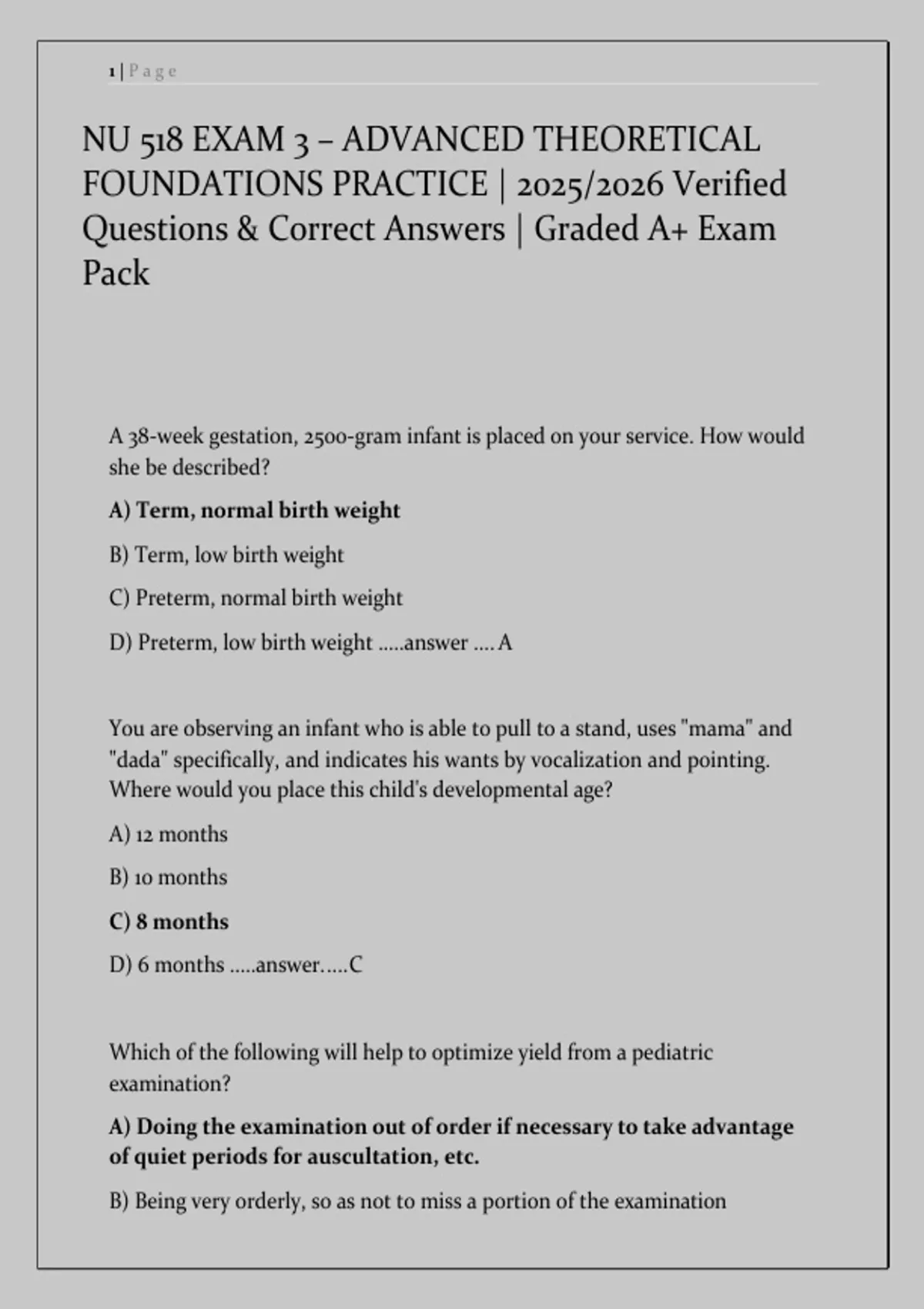 Advanced-level exam questions focused on applied nursing theory and professional practice. This pack includes verified answers and exam-aligned content for NU 518 Exam 3. Excellent for deepening theoretical understanding and achieving top exam scores.