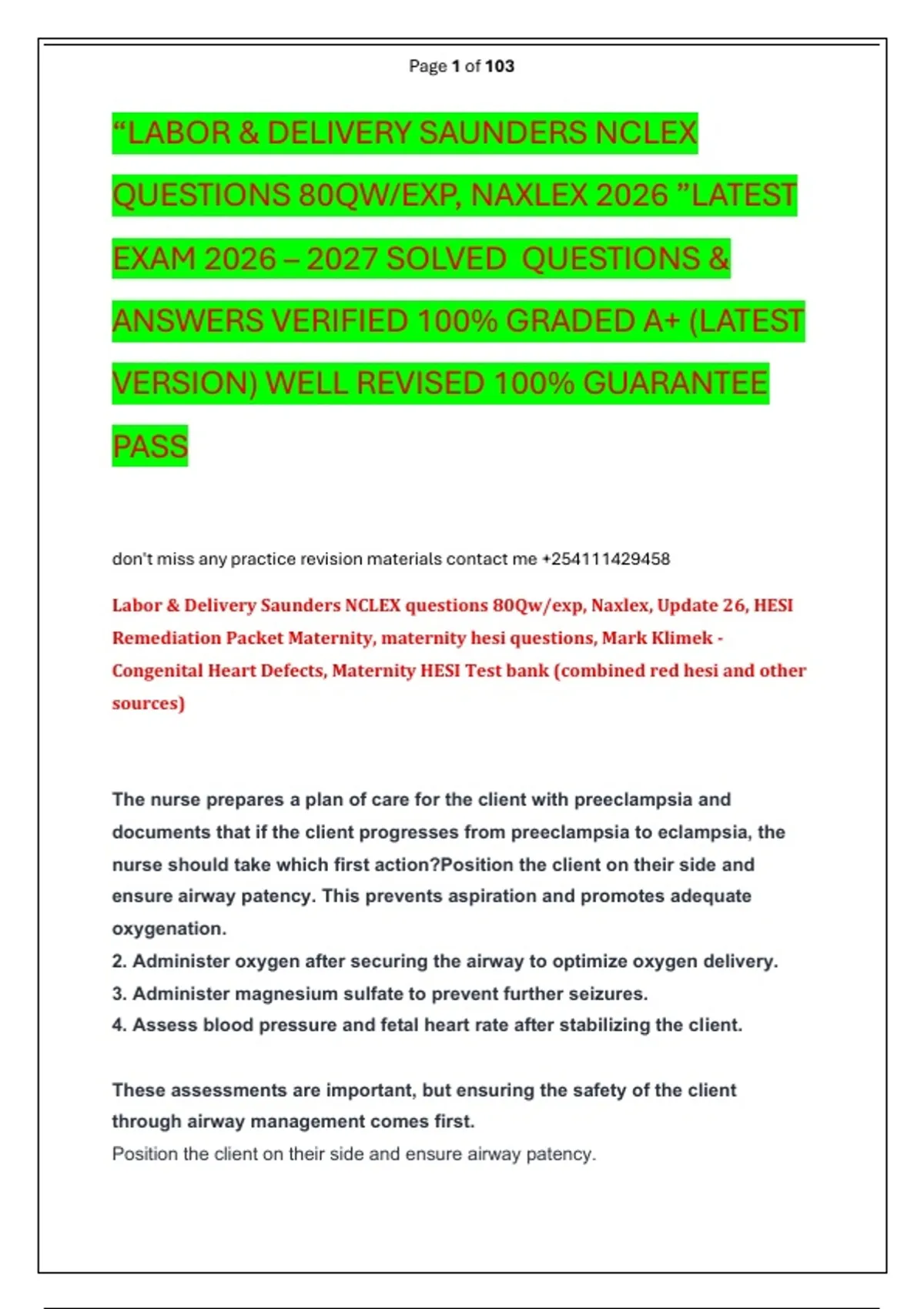 “LABOR & DELIVERY SAUNDERS NCLEX QUESTIONS 80QW/EXP, NAXLEX 2026 ”LATEST EXAM 2026 – 2027 SOLVED QUESTIONS & ANSWERS VERIFIED 100% GRADED A+ (LATEST VERSION) WELL REVISED 100% GUARANTEE PASS
