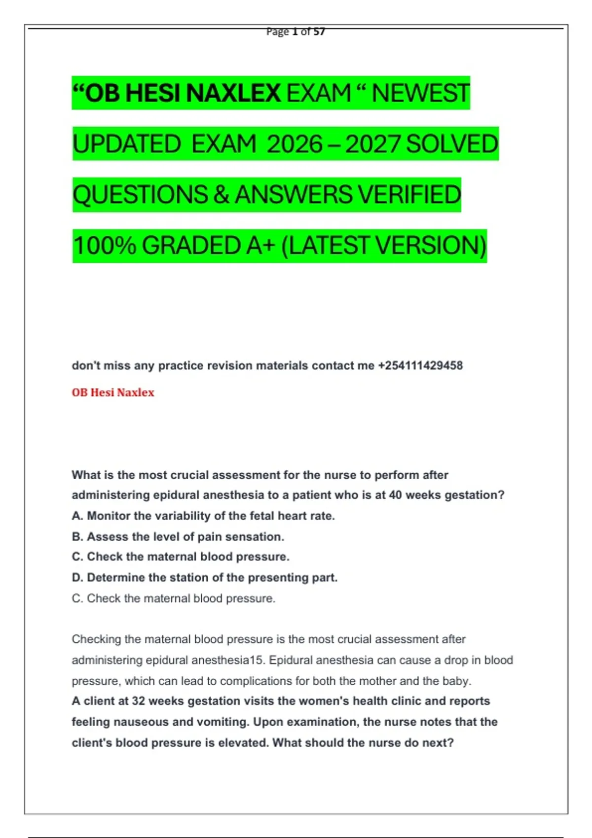“OB HESI NAXLEX EXAM “ NEWEST UPDATED EXAM 2026 – 2027 SOLVED QUESTIONS & ANSWERS VERIFIED 100% GRADED A+ (LATEST VERSION)