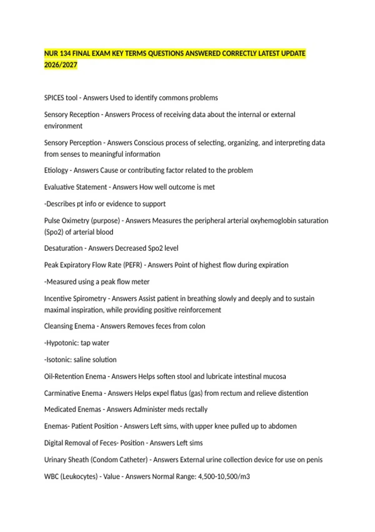 NUR 134 FINAL EXAM KEY TERMS QUESTIONS ANSWERED CORRECTLY LATEST UPDATE 2026/2027 SPICES tool - Answers Used to identify commons problems Sensory Reception - Answers Process of receiving data about the internal or external environment Sensory Perception - Answers Conscious process of selecting, organizing, and interpreting data from senses to meaningful information Etiology - Answers Cause or contributing factor related to the problem Evaluative Statement - Answers How well outcome is met -Describes pt info or evidence to support Pulse Oximetry (purpose) - Answers Measures the peripheral arterial oxyhemoglobin saturation (Spo2) of arterial blood Desaturation - Answers Decreased Spo2 level Peak Expiratory Flow Rate (PEFR) - Answers Point of highest flow during expiration -Measured using a peak flow meter Incentive Spirometry - Answers Assist patient in breathing slowly and deeply and to sustain maximal inspiration, while providing positive reinforcement Cleansing Enema - Answers Removes feces from colon -Hypotonic: tap water -Isotonic: saline solution Oil-Retention Enema - Answers Helps soften stool and lubricate intestinal mucosa Carminative Enema - Answers Helps expel flatus (gas) from rectum and relieve distention Medicated Enemas - Answers Administer meds rectally Enemas- Patient Position - Answers Left sims, with upper knee pulled up to abdomen Digital Removal of Feces- Position - Answers Left sims Urinary Sheath (Condom Catheter) - Answers External urine collection device for use on penis WBC (Leukocytes) - Value - Answers Normal Range: 4,500-10,500/m3 Leukocytosis - Answers Elevated WBC >10,500 Leukopenia - Answers Decreased WBC <4,500