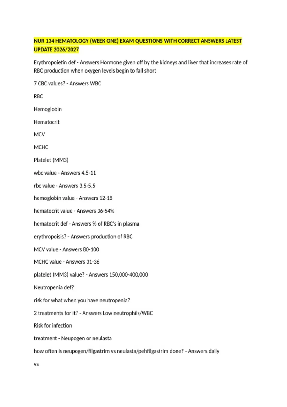 NUR 134 HEMATOLOGY (WEEK ONE) EXAM QUESTIONS WITH CORRECT ANSWERS LATEST UPDATE 2026/2027 Erythropoietin def - Answers Hormone given off by the kidneys and liver that increases rate of RBC production when oxygen levels begin to fall short 7 CBC values? - Answers WBC RBC Hemoglobin Hematocrit MCV MCHC Platelet (MM3) wbc value - Answers 4.5-11 rbc value - Answers 3.5-5.5 hemoglobin value - Answers 12-18 hematocrit value - Answers 36-54% hematocrit def - Answers % of RBC's in plasma erythropoisis? - Answers production of RBC MCV value - Answers 80-100 MCHC value - Answers 31-36 platelet (MM3) value? - Answers 150,000-400,000 Neutropenia def? risk for what when you have neutropenia? 2 treatments for it? - Answers Low neutrophils/WBC Risk for infection treatment - Neupogen or neulasta how often is neupogen/filgastrim vs neulasta/pehfilgastrim done? - Answers daily vs once between treatments Thrombocytopenia def? risk for? treatment? - Answers low platelets risk for bleeding/injury transfuse platelets anemia def? three treatments? - Answers Low RBC (HGB or HCT) Treatment: PROCRIT (epoetin alfa), blood transfusion, and iron rich foods examples of iron rich foods? - Answers red mear dark leafy greens dried fruit iron rich cereals mollusks turkey or chicken giblets beans, lentils, chickpeas, and soybeans Pancytopenia def - Answers Significant drop in RBC, WBC, and platelets