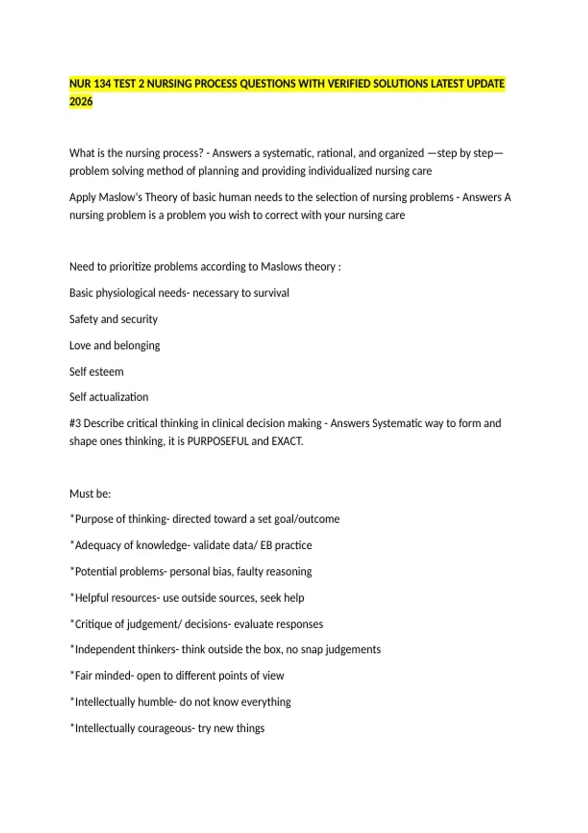 NUR 134 TEST 2 NURSING PROCESS QUESTIONS WITH VERIFIED SOLUTIONS LATEST UPDATE 2026 What is the nursing process? - Answers a systematic, rational, and organized —step by step— problem solving method of planning and providing individualized nursing care Apply Maslow's Theory of basic human needs to the selection of nursing problems - Answers A nursing problem is a problem you wish to correct with your nursing care Need to prioritize problems according to Maslows theory : Basic physiological needs- necessary to survival Safety and security Love and belonging Self esteem Self actualization #3 Describe critical thinking in clinical decision making - Answers Systematic way to form and shape ones thinking, it is PURPOSEFUL and EXACT. Must be: *Purpose of thinking- directed toward a set goal/outcome *Adequacy of knowledge- validate data/ EB practice *Potential problems- personal bias, faulty reasoning *Helpful resources- use outside sources, seek help *Critique of judgement/ decisions- evaluate responses *Independent thinkers- think outside the box, no snap judgements *Fair minded- open to different points of view *Intellectually humble- do not know everything *Intellectually courageous- try new things Integrity- sensitive to discrepancies *Curious and preserving- keep asking why, seeks new knowledge *Creative- brainstorming, problem solving *Confidence- sure do their decision What is the nursing process and its importance? - Answers ADPIE 1) Assess- the pt to determine the need for nursing care 2) Diagnose- determine the nursing diagnoses for actual and potential health problems 3) Planning- identify outcome and plan care 4) Impliment the care 5) Evaluatethe the results