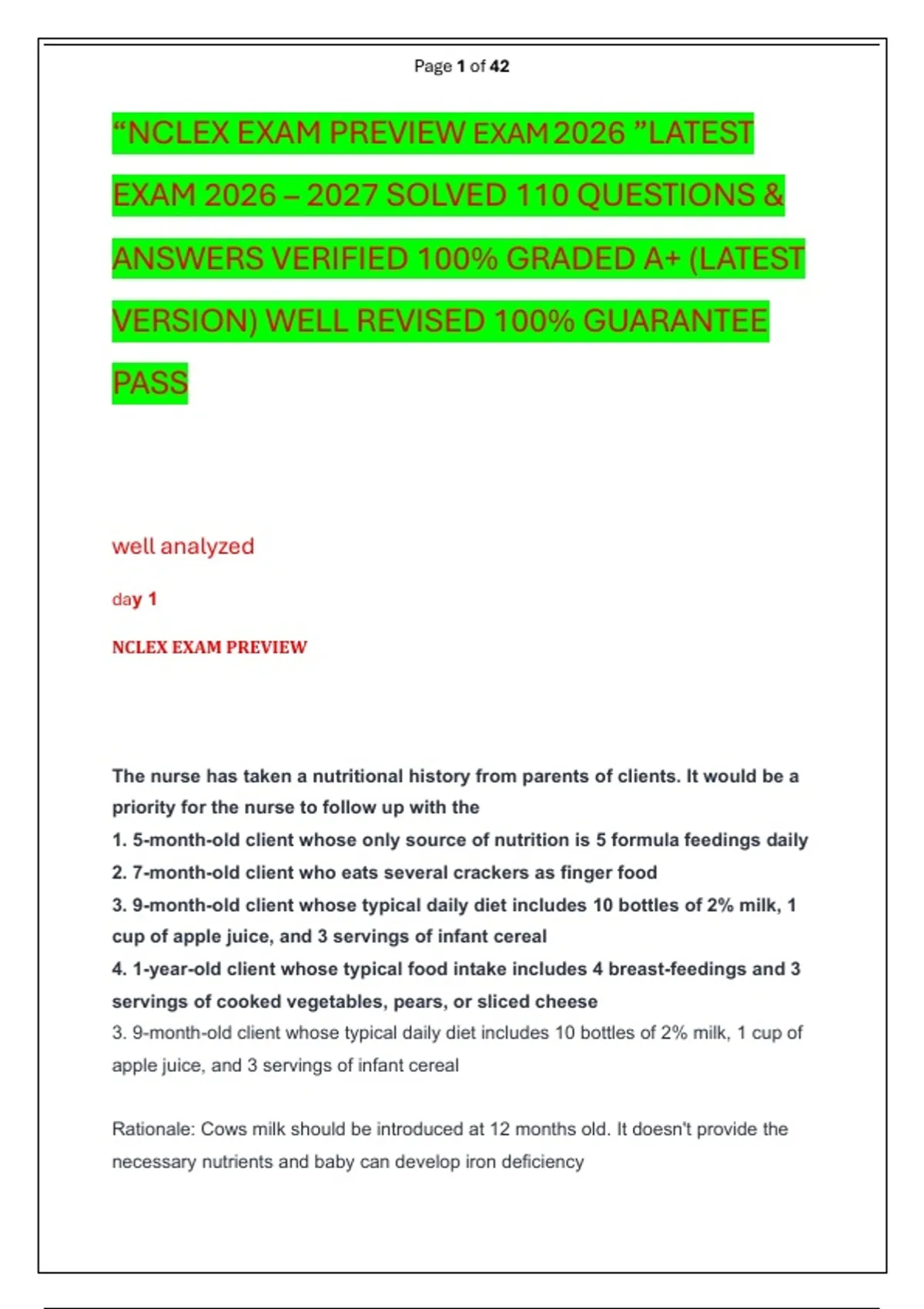3. 9-month-old client whose typical daily diet includes 10 bottles of 2% milk, 1 cup of