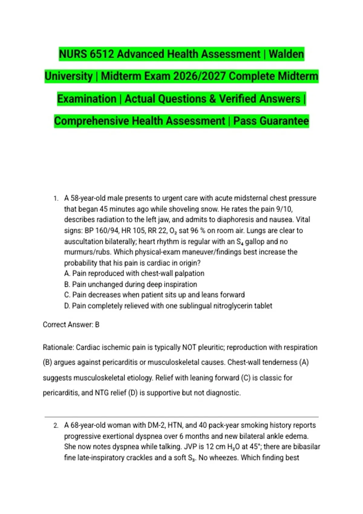 1. A 58-year-old male presents to urgent care with acute midsternal chest pressure
