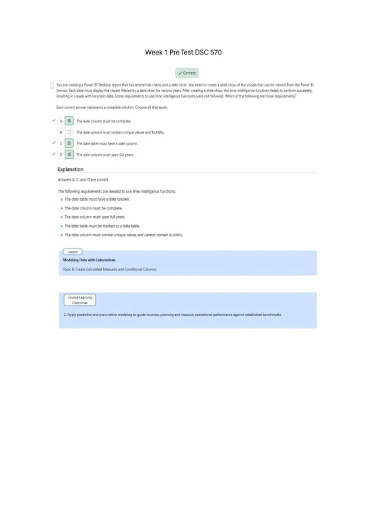 DSC 570 Week 1 Pre-Test | Actual Questions and Answers | 2026 Update | 100% Correct | A Grade This DSC 570 Week 1 Pre-Test for University of Phoenix's Business Intelligence course covers foundational concepts in data analysis and visualization, focusing on tools like Power BI, including creating reports with charts/slicers, understanding data relationships, using the GetData function, defining visualizations, and basic data integration/modeling. Questions test knowledge on Power BI Desktop, connecting to data (like LiveConnect mode), data modeling (relationships, entities), and basic business intelligence terminology, referencing M language and common data service concepts. Key Topics Covered: • Power BI Desktop Basics: Creating reports with bar charts, date slicers, and publishing to Power BI Service for slideshows. • Data Connectivity & Preparation: Using the GetData button, understanding LiveConnect mode, and the Enter Data command (opening the Table dialog). • Data Modeling: Defining relationships between tables and understanding the Model view for entity relationships. • Visualization: Identifying charts/graphs as visualizations, using color coding in highlight tables for comparison (Gestalt principles). • Data Science Fundamentals: Basic data integration for collaboration, challenges with social media data, and keyword searching in graphs.