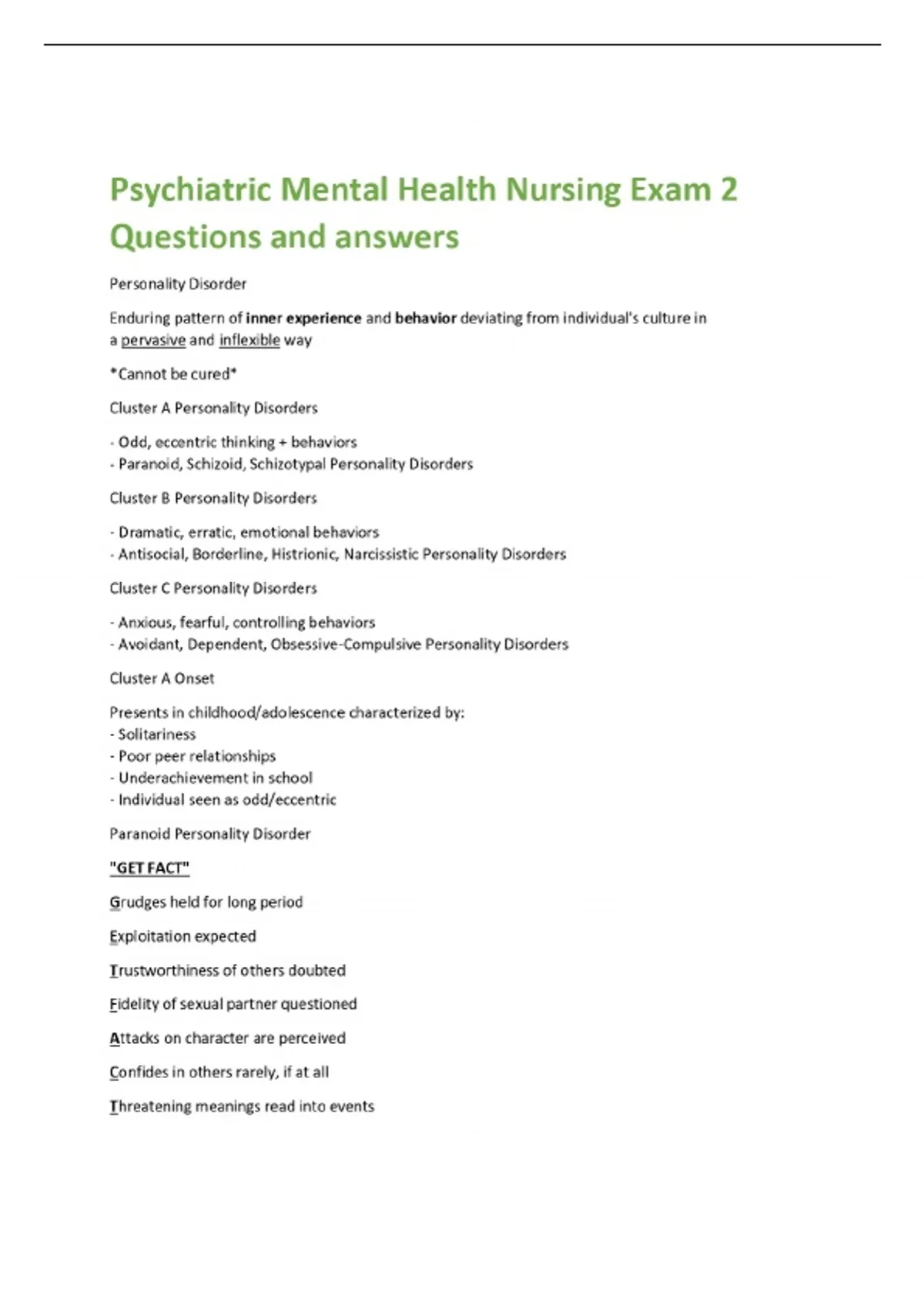 Psychiatric Mental Health Nursing Exam 2 Questions and answers Personality Disorder Enduring pattern of inner experience and behavior deviating from individual's culture in a pervasive and inflexible way *Cannot be cured* Cluster A Personality Disorders - Odd, eccentric thinking + behaviors - Paranoid, Schizoid, Schizotypal Personality Disorders Cluster B Personality Disorders - Dramatic, erratic, emotional behaviors - Antisocial, Borderline, Histrionic, Narcissistic Personality Disorders Cluster C Personality Disorders - Anxious, fearful, controlling behaviors - Avoidant, Dependent, Obsessive-Compulsive Personality Disorders Cluster A Onset Presents in childhood/adolescence characterized by: