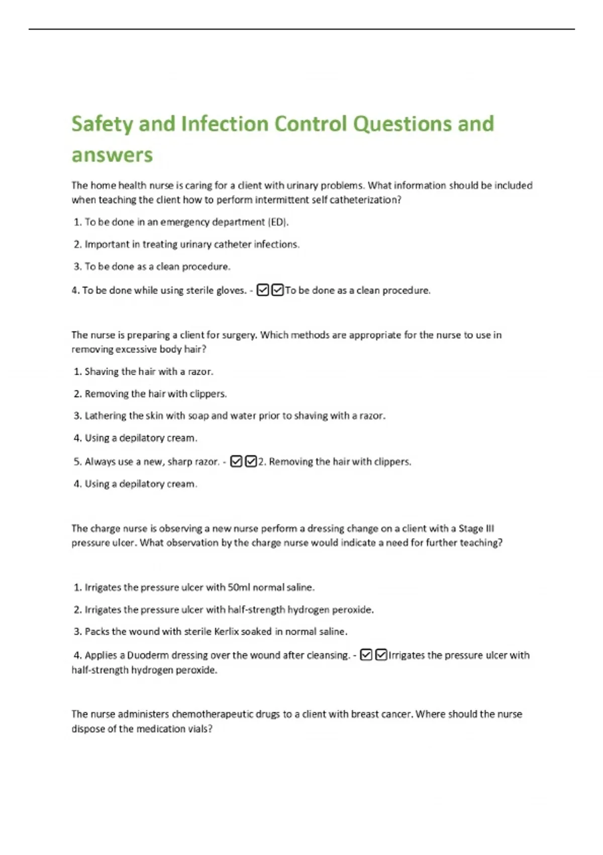 Safety and Infection Control Questions and answers The home health nurse is caring for a client with urinary problems. What information should be included when teaching the client how to perform intermittent self catheterization? 1. To be done in an emergency department (ED). 2. Important in treating urinary catheter infections. 3. To be done as a clean procedure. 4. To be done while using sterile gloves. - To be done as a clean procedure. The nurse is preparing a client for surgery. Which methods are appropriate for the nurse to use in removing excessive body hair? 1. Shaving the hair with a razor. 2. Removing the hair with clippers. 3. Lathering the skin with soap and water prior to shaving with a razor. 4. Using a depilatory cream. 5. Always use a new, sharp razor. - 2. Removing the hair with clippers. 4. Using a depilatory cream. The charge nurse is observing a new nurse perform a dressing change on a client with a Stage III pressure ulcer. What observation by the charge nurse would indicate a need for further teachi