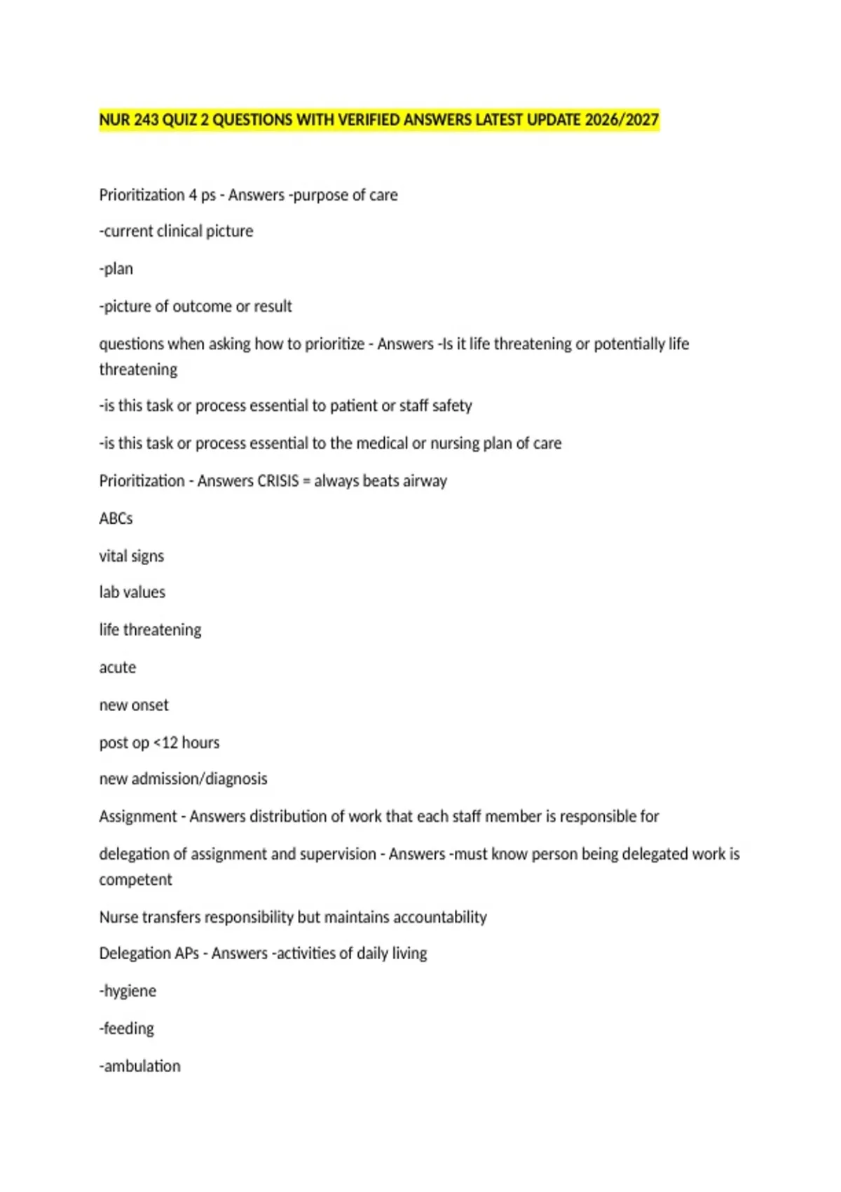 NUR 243 QUIZ 2 QUESTIONS WITH VERIFIED ANSWERS LATEST UPDATE 2026/2027 Prioritization 4 ps - Answers -purpose of care -current clinical picture -plan -picture of outcome or result questions when asking how to prioritize - Answers -Is it life threatening or potentially life threatening -is this task or process essential to patient or staff safety -is this task or process essential to the medical or nursing plan of care Prioritization - Answers CRISIS = always beats airway ABCs vital signs lab values life threatening acute new onset post op <12 hours new admission/diagnosis Assignment - Answers distribution of work that each staff member is responsible for delegation of assignment and supervision - Answers -must know person being delegated work is competent Nurse transfers responsibility but maintains accountability Delegation APs - Answers -activities of daily living -hygiene -feeding -ambulation -ROM