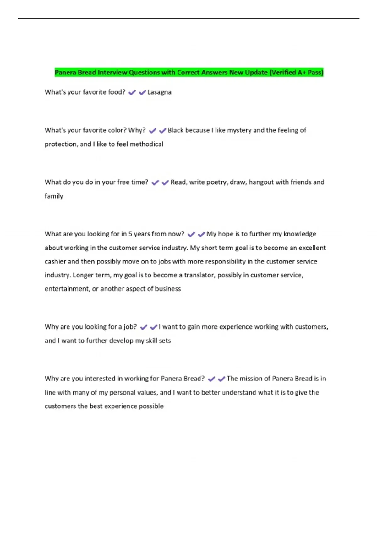 Panera Bread Interview Questions with Correct Answers New Update (Verified A+ Pass)