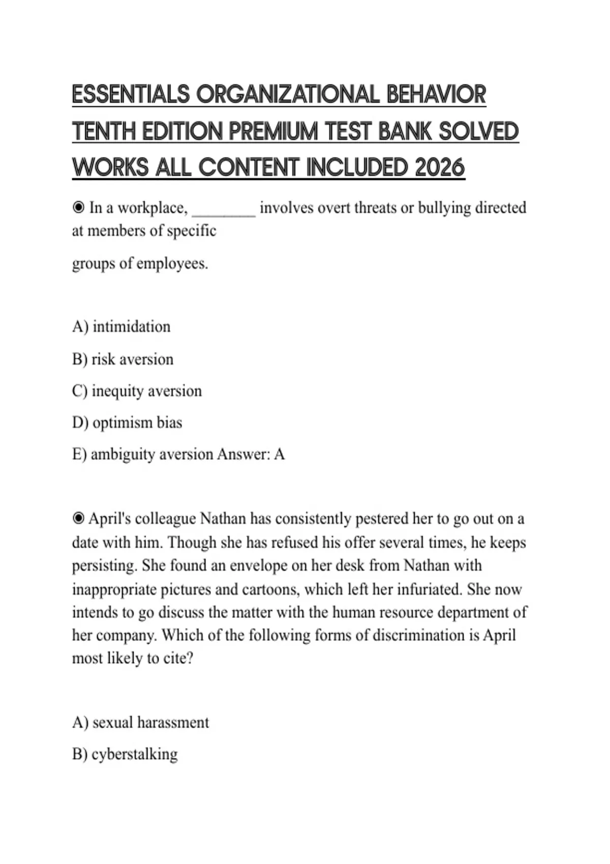 ESSENTIALS ORGANIZATIONAL BEHAVIOR TENTH EDITION PREMIUM TEST BANK SOLVED WORKS ALL CONTENT INCLUDED 2026