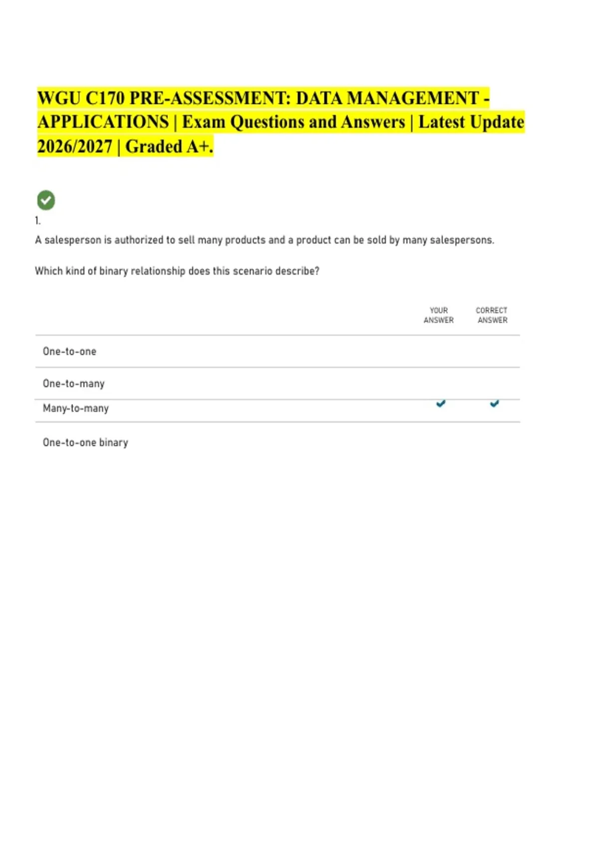 WGU C170 PRE-ASSESSMENT: DATA MANAGEMENT - APPLICATIONS | Exam Questions and Answers | Latest Update 2026/2027 | Graded A+. A salesperson is authorized to sell many products and a product can be sold by many salespersons. Which kind of binary relationship does this scenario describe? YOUR CORRECT ANSWER ANSWER One-to-one One-to-many One-to-one binary Many-to-many Which kind of relationship is displayed in this entity-relationship diagram? CORRECT YOUR ANSWER ANSWE R One-to-one binary One-to-one unary Many-to-many binary Many-to-many unary WGU C1703. Which kind of relationship is displayed in this entity-relationship diagram? CORRECT YOUR ANSWER ANSWE R many-to-many Binary oneto-one Binary many-tomany Ternary one-to-one Unary one-to-one Unary Ternarymany-to-many