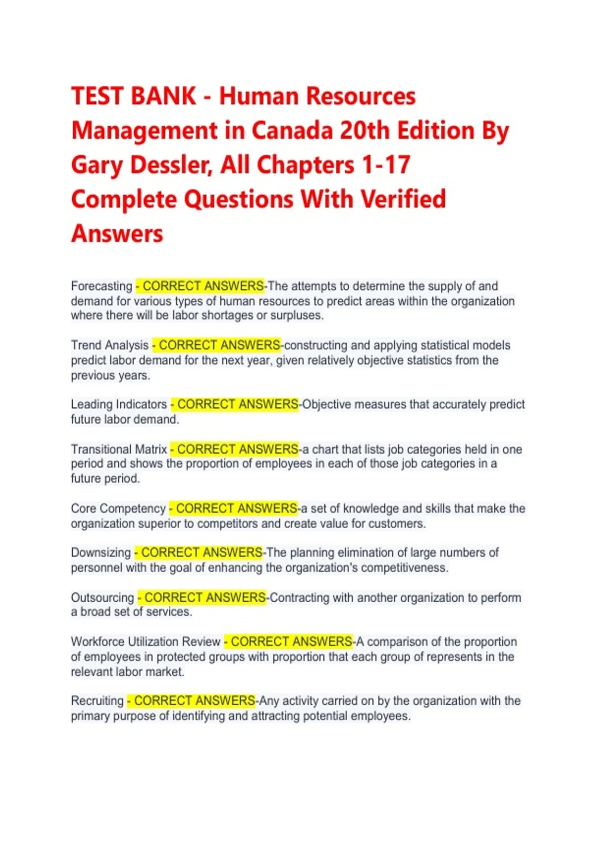 Ace your exams with the official Test Bank for Dessler's HRM in Canada 20E. Features verified answers for all chapters (1-17). Complete resource for students and instructors.