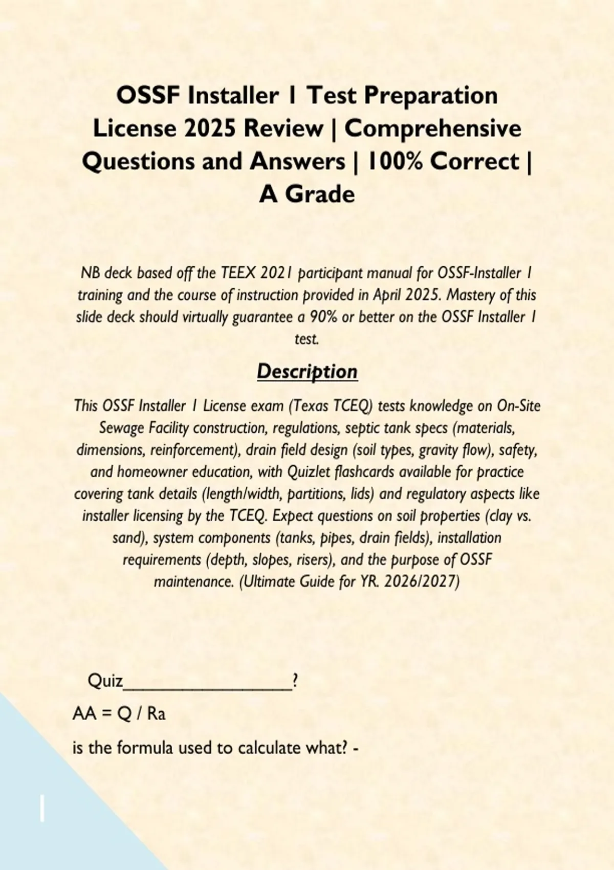 This OSSF Installer 1 License exam (Texas TCEQ) tests knowledge on On-Site