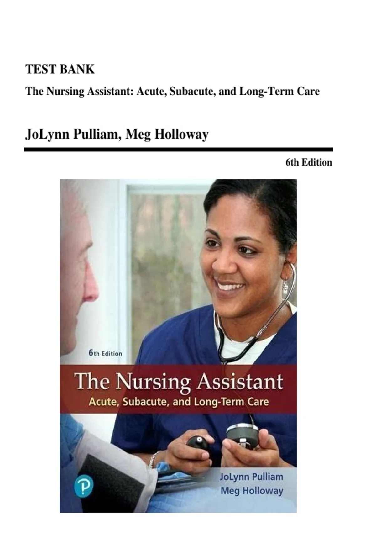 Test Bank for The Nursing Assistant: Acute, Subacute, and Long-Term Care, 6th Edition by JoLynn Pulliam and Meg Holloway – Complete and Updated Coverage.