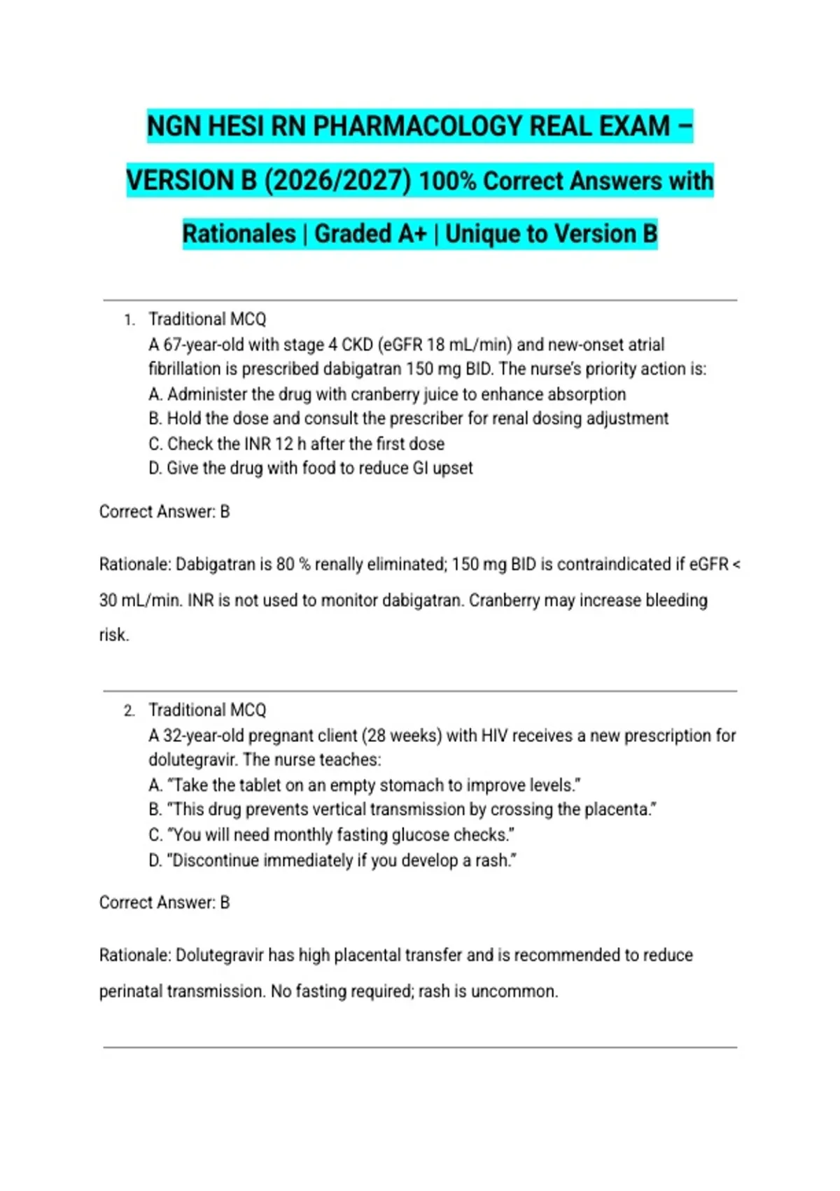 NGN HESI RN PHARMACOLOGY REAL EXAM – VERSION B (2026/2027) 100% Correct Answers with Rationales | Graded A+ | Unique to Version B